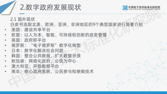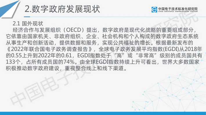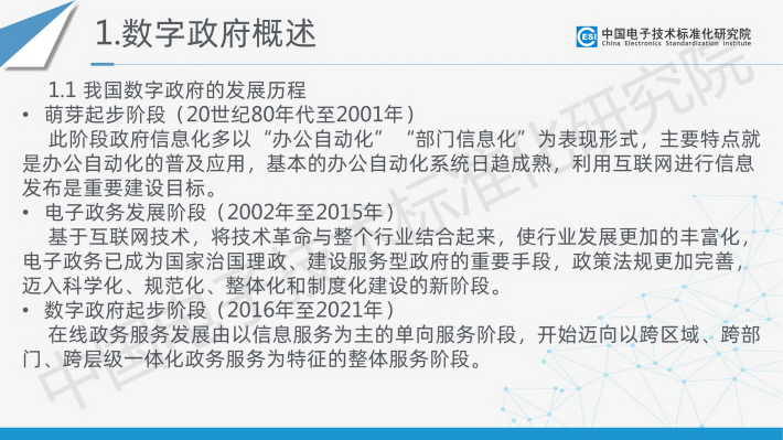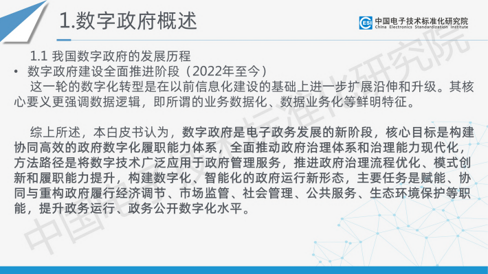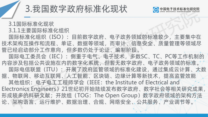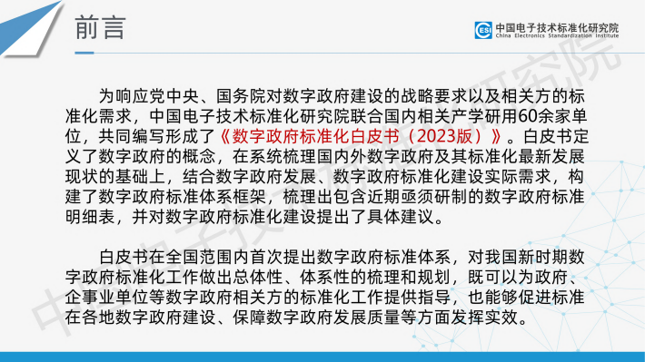 为响应党中央、国务院对数字政府建设的战略要求以及相关方的标准化需求,中国电子技术标准化研究院联合国内相关产学研用60余家单位,共同编写形成了《数字政府标准化白皮书(2023版)》。白皮书定义了数字政府的概念,在系统梳理国内外数字政府及其标准化最新发展现状的基础上,结合数字政府发展、数字政府标准化建设实际需求,构建了数字政府标准体系框架,梳理出包含近期亟须研制的数字政府标准明细表,并对数字政府标准化建设提出了具体建议。