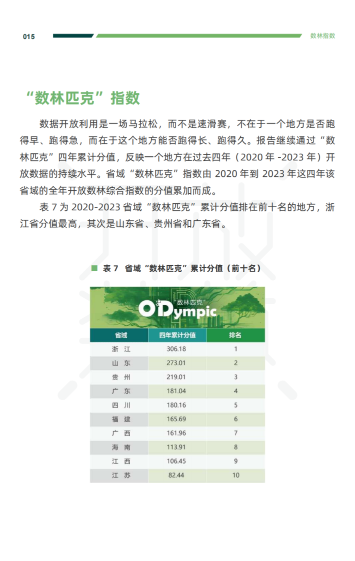 2023年起,开放数林指数将年度报告的名称从《中国地方政府数据开放报告》改为《中国地方公共数据开放利用报告》,以体现从“政府数据开放”迈向“公共数据开放”的方向,以及指数对公共数据从流通、到利用、到价值释放全过程的关注。开放数林指数将省及其下辖地市作为一个整体的“区域”来进行评测,并发布《中国地方公共数据开放利用报告——省域》(以下简称《报告》)。