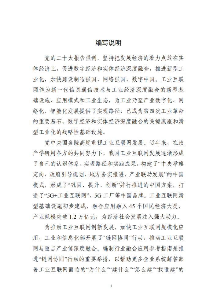 为推动工业互联网创新发展,加快工业互联网规模化应用,工业和信息化部开展了“链网协同”行动,推动工业互联网与重点产业链深度融合。编制行业融合应用参考指南是推进“链网协同”行动的重要举措,以帮助更多企业系统解答部署工业互联网面临的“为什么”“建什么“怎么建”“找谁建”的问题,为各行业建设工业互联网明确体系化、可落地的赋能价值,提供轻量化、可复制的建设指引,打造差异化、可操作的实践路径,汇聚多元化、可细分的供给资源。