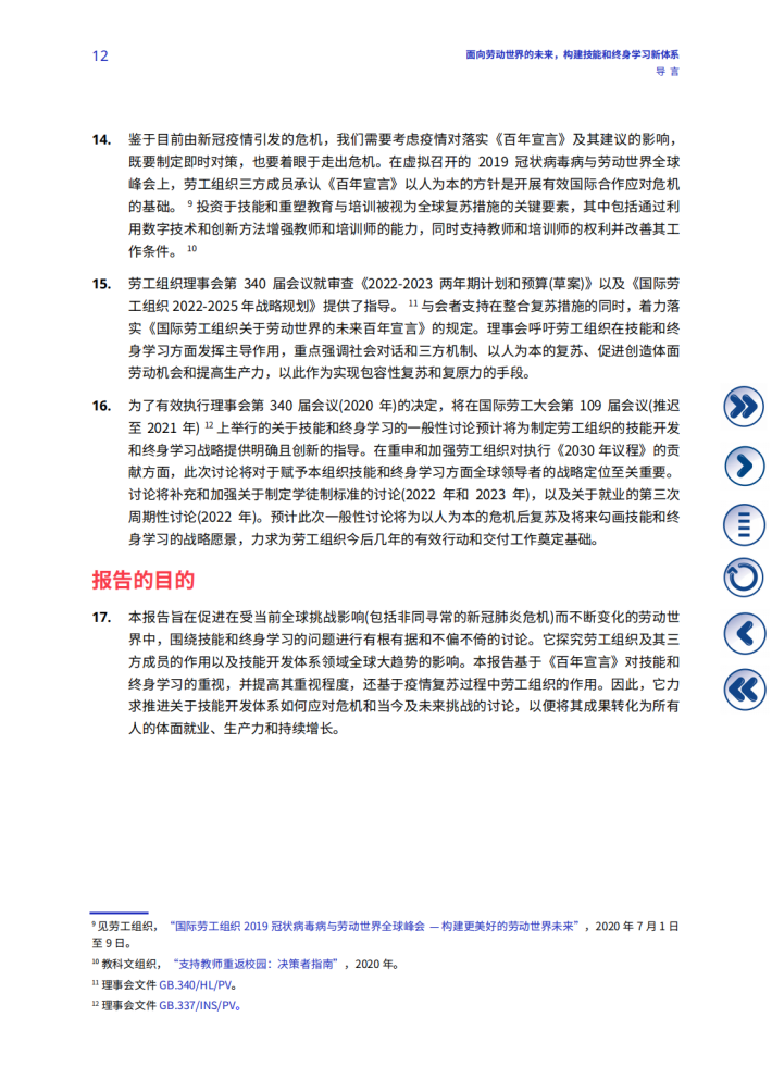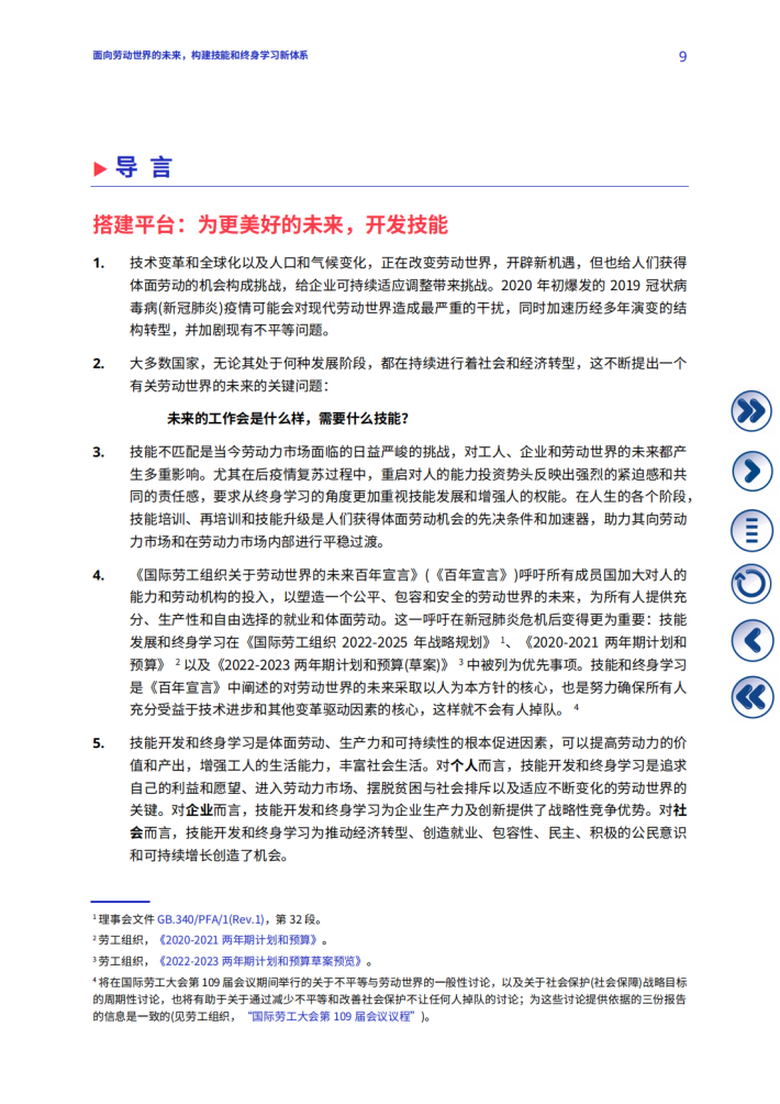《国际劳工组织关于劳动世界的未来百年宣言》(《百年宣言》)呼吁所有成员国加大对人的能力和劳动机构的投入,以塑造一个公平、包容和安全的劳动世界的未来,为所有人提供充分、生产性和自由选择的就业和体面劳动。这一呼吁在新冠肺炎危机后变得更为重要:技能发展和终身学习在《国际劳工组织2022-2025年战略规划》《2020-2021两年期计划和预算》2以及《2022-2023两年期计划和预算(草案)》中被列为优先事项。技能和终身学习是《百年宣言》中阐述的对劳动世界的未来采取以人为本方针的核心,也是努力确保所有人充分受益于技术进步和其他变革驱动因素的核心,这样就不会有人掉队。