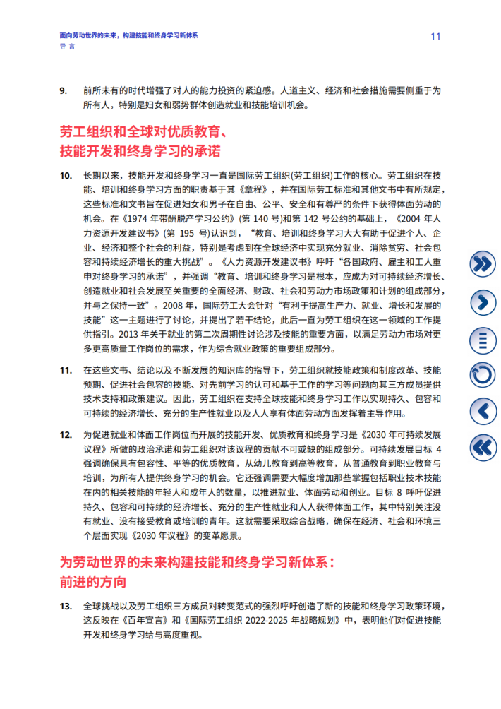 技能不匹配是当今劳动力市场面临的日益严峻的挑战,对工人、企业和劳动世界的未来都产生多重影响。尤其在后疫情复苏过程中,重启对人的能力投资势头反映出强烈的紧迫感和共同的责任感,要求从终身学习的角度更加重视技能发展和增强人的权能。在人生的各个阶段,技能培训、再培训和技能升级是人们获得体面劳动机会的先决条件和加速器,助力其向劳动力市场和在劳动力市场内部进行平稳过渡。