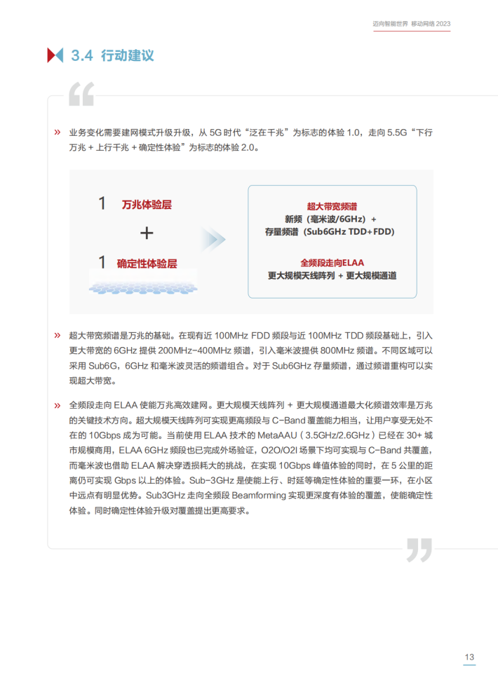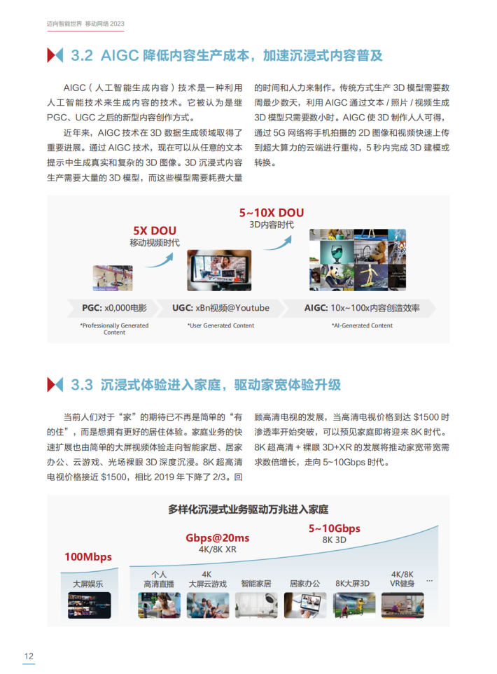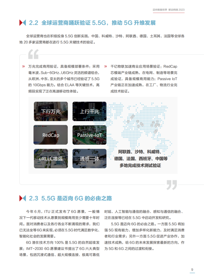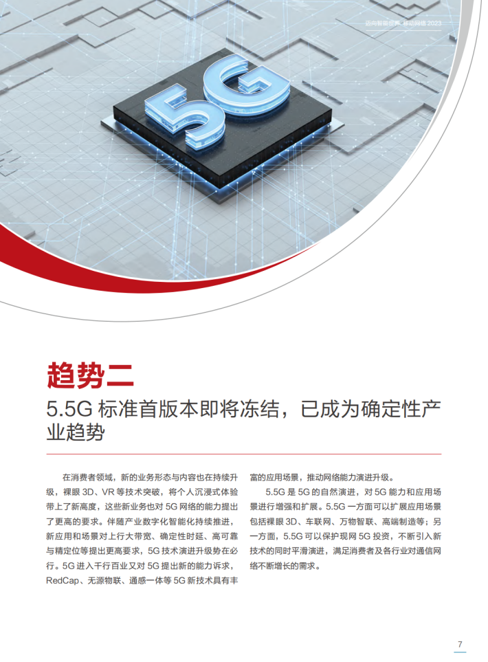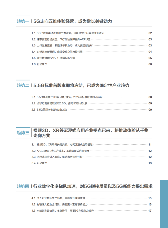 5G的巨大成功,打开了新应用新业态新空间,人、家、车、物、行业等业务开始加速升级。2023年,裸眼3D、沉浸式XR、AIGC等技术取得突破,将个人沉浸式体验带上了新高度;家庭业务走向多样化业务的智慧家庭,万兆FWA加速走向成熟。蜂窝物联超人联已是现实,千亿物联全景清晰,需要丰富多样化物联类型;5G行业应用从辅助生产走向核心生产环节,需要低时延和上行的确定性体验;车联正在走向高可靠智慧交通,5G需要继续升级车联能力;最后,更多的行业应用需要5G超越联接,提供感知新能力。