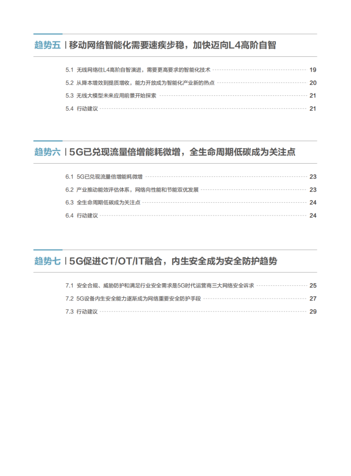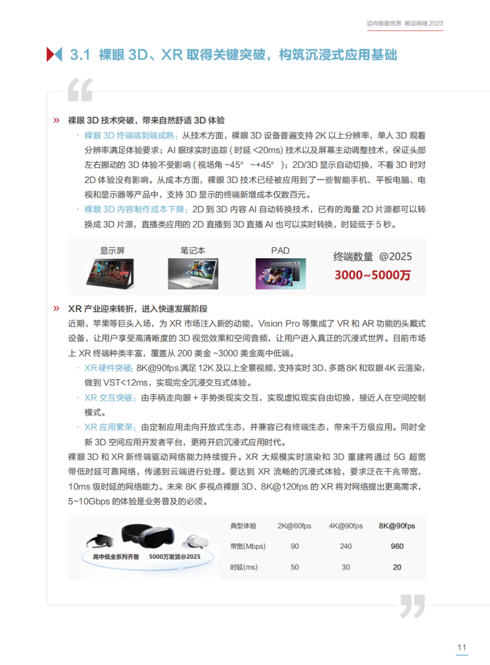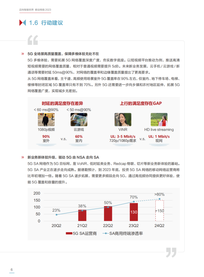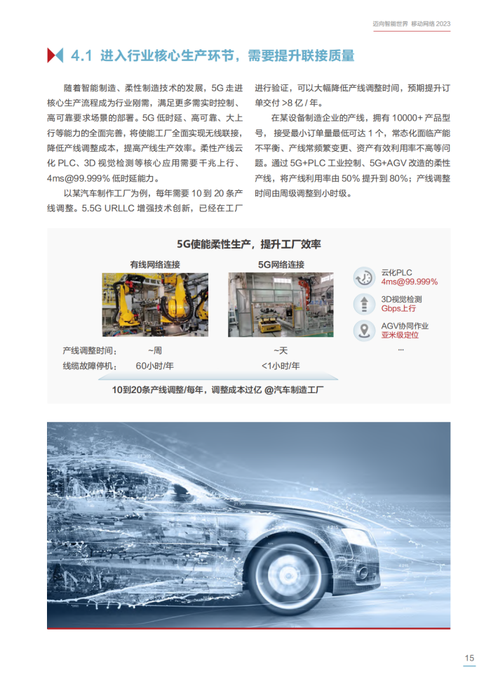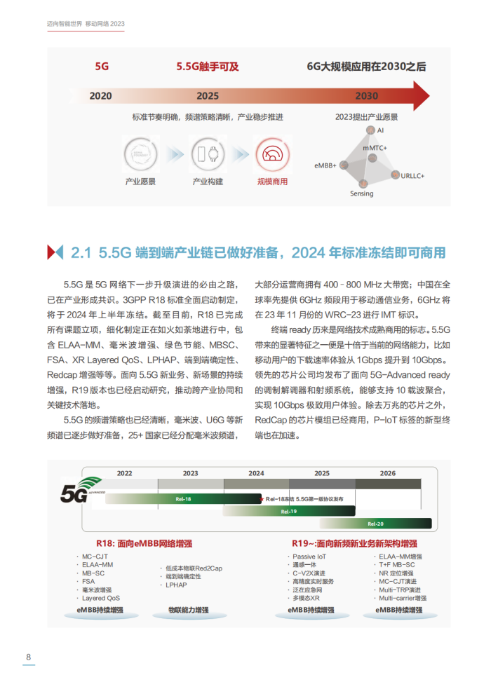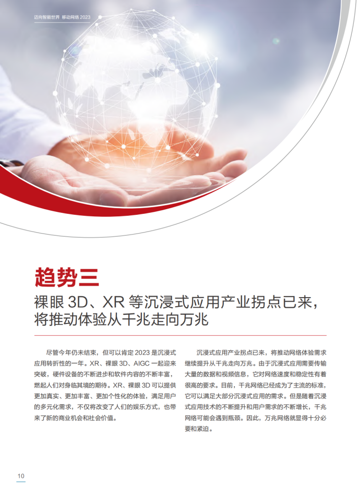 5G的巨大成功,打开了新应用新业态新空间,人、家、车、物、行业等业务开始加速升级。2023年,裸眼3D、沉浸式XR、AIGC等技术取得突破,将个人沉浸式体验带上了新高度;家庭业务走向多样化业务的智慧家庭,万兆FWA加速走向成熟。蜂窝物联超人联已是现实,千亿物联全景清晰,需要丰富多样化物联类型;5G行业应用从辅助生产走向核心生产环节,需要低时延和上行的确定性体验;车联正在走向高可靠智慧交通,5G需要继续升级车联能力;最后,更多的行业应用需要5G超越联接,提供感知新能力。