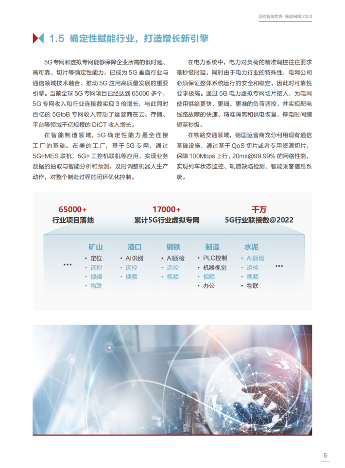 5G是移动通信技术中部署最快的一代技术,发展速度远超预期。自2019年正式商用以来,全球5G商用发展迅速。截至目前,全球已经90多个国家/地区的260多家网络运营商开始提供5G业务。5G改变了消费者的视频体验,移动网络上高清视频的比例从40%增长到了60%。在行业市场,5G也加速了各行各业的数字化进程。到目前为止已经有超过5万多个5G行业应用在全球各地部署。