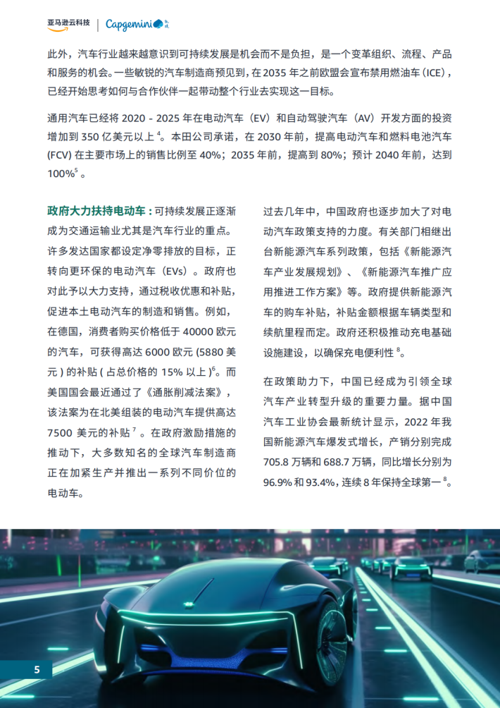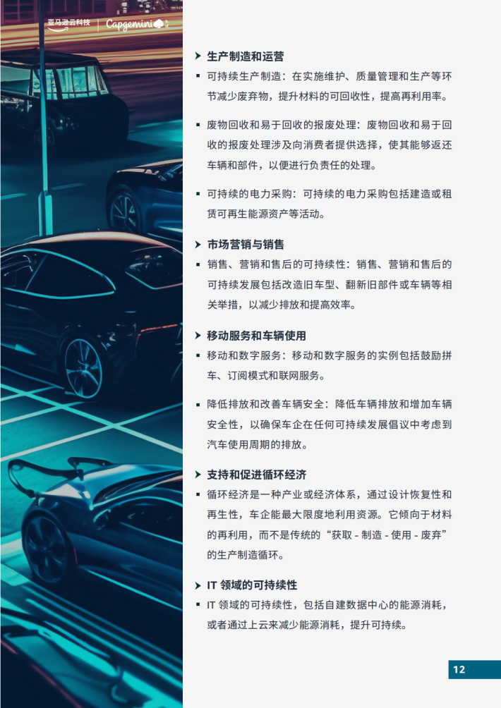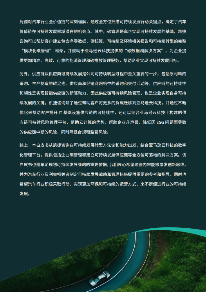 综上,本白皮书从凯捷咨询在可持续发展转型方法论和能力出发,结合亚马逊云科技的数字化管理平台,提供包括企业碳管理和建立可持续发展供应链等全方位可落地的解决方案。该白皮书也是车企规划可持续发展战略的重要依据。我们衷心希望这些内容能够激发创新思维,并为汽车行业及利益相关者制定可持续发展战略和管理措施提供重要的参考和指导,同时也希望汽车行业积极采取行动,实现更加环保和可持续的运营方式,来不断促进行业的可持续发展。