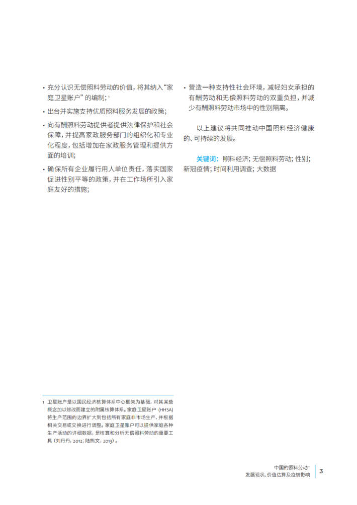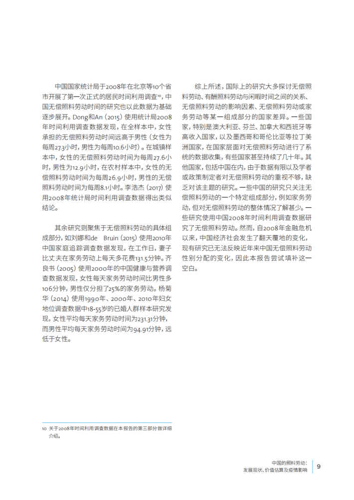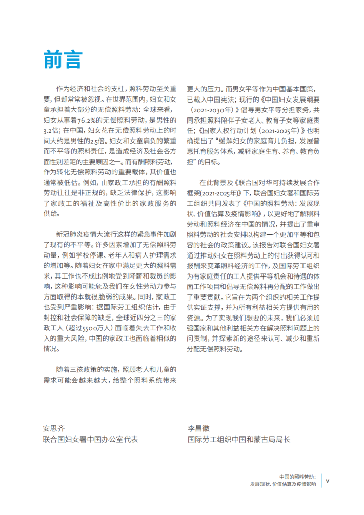 作为经济和社会的支柱,照料劳动至关重要,但却常常被忽视。在世界范围内,妇女和女童承担着大部分的无偿照料劳动:全球来看,妇女从事着76.2%的无偿照料劳动,是男性的3.2倍;在中国,妇女花在无偿照料劳动上的时间大约是男性的2.5倍。妇女和女童肩负的繁重而不平等的照料责任,是造成经济及社会各方面性别差距的主要原因之一。而有酬照料劳动,作为转化无偿照料劳动的重要载体,其价值也通常被低估。例如,由家政工承担的有酬照料劳动往往是非正规的,缺乏法律保护,这影响了家政工的福祉及高性价比的家政服务的供给。