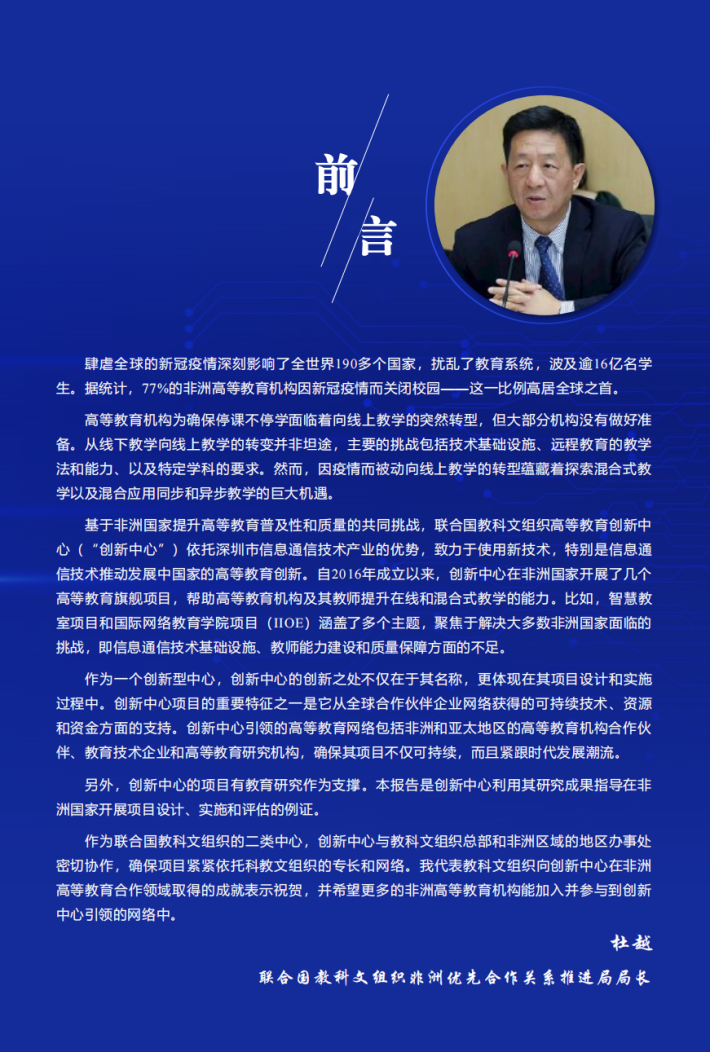 作为联合国教科文组织的二类中心,创新中心与教科文组织总部和非洲区域的地区办事处密切协作,确保项目紧紧依托科教文组织的专长和网络。我代表教科文组织向创新中心在非洲高等教育合作领域取得的成就表示祝贺,并希望更多的非洲高等教育机构能加入并参与到创新中心引领的网络中。