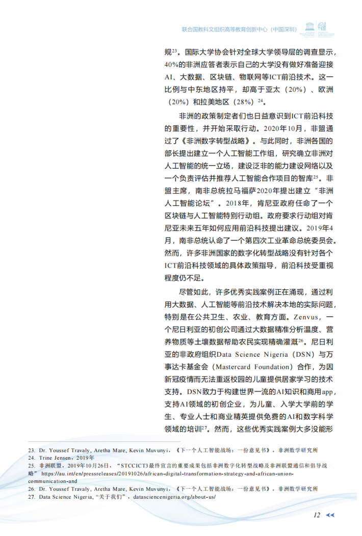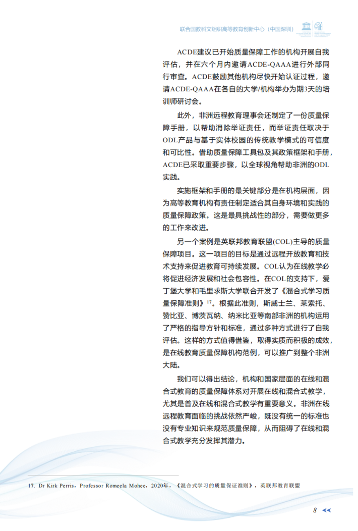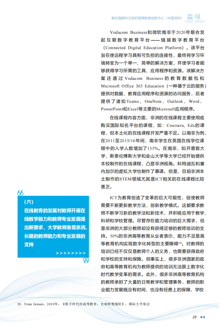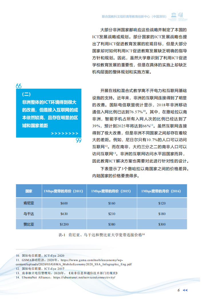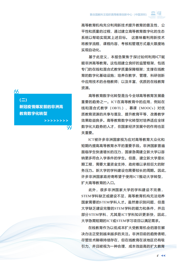 基于非洲国家提升高等教育普及性和质量的共同挑战,联合国教科文组织高等教育创新中心(“创新中心”)依托深圳市信息通信技术产业的优势,致力于使用新技术,特别是信息通信技术推动发展中国家的高等教育创新。自2016年成立以来,创新中心在非洲国家开展了几个高等教育旗舰项目,帮助高等教育机构及其教师提升在线和混合式教学的能力。比如,智慧教室项目和国际网络教育学院项目(IIOE)涵盖了多个主题,聚焦于解决大多数非洲国家面临的挑战,即信息通信技术基础设施、教师能力建设和质量保障方面的不足。