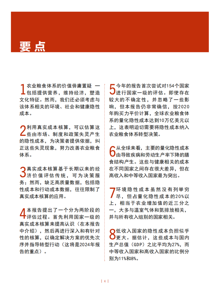今年的报告以真实成本核算为抓手,揭示了农业粮食体系对环境、健康和生计的潜在影响,以便农业粮食体系行为主体作出知情决策。人们往往会担心,如果考虑粮食生产的所有隐性成本,价格就会上涨。但是,将这些成本纳入决策过程,以及面向生产者和消费者的激励措施,理应是农业粮食体系更广阔转型进程的一部分。真实成本核算旨在支持国家和私营部门做出正确投资决策,降低现有成本,而非使其永久固化。