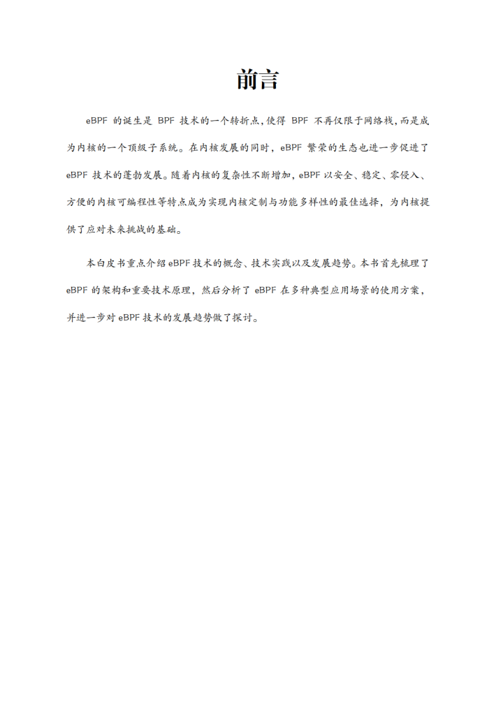 本白皮书重点介绍eBPF技术的概念、技术实践以及发展趋势。本书首先梳理了eBPF的架构和重要技术原理,然后分析了eBPF在多种典型应用场景的使用方案,并进一步对eBPF技术的发展趋势做了探讨。