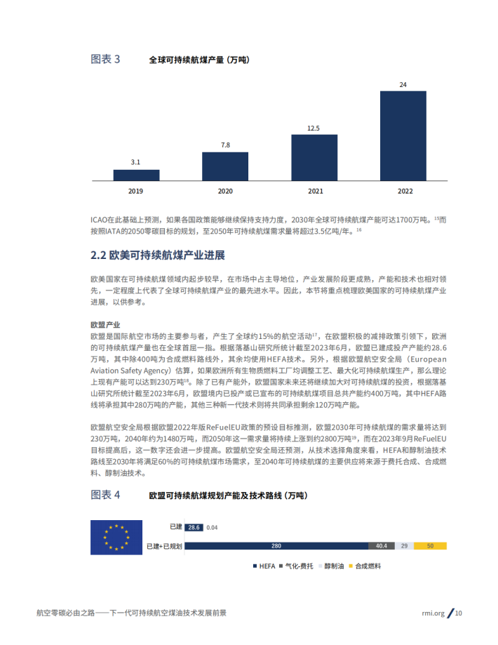 我国的可持续航煤产业正处于起步阶段,得益于《“十四五”民航绿色发展专项规划》等政策的支持,2022年以来可持续航煤的需求与产能正在快速增加,相关市场也在迅速成熟。统计数据显示,我国已建成的可持续航煤年产能达到了20万吨,已宣布的可持续航煤规划产能已达390万吨,随着空中客车、中国国际航空、国泰航空等航煤消费企业与航司的加入,我国的可持续航煤市场已初具雏形。