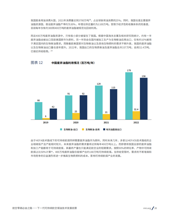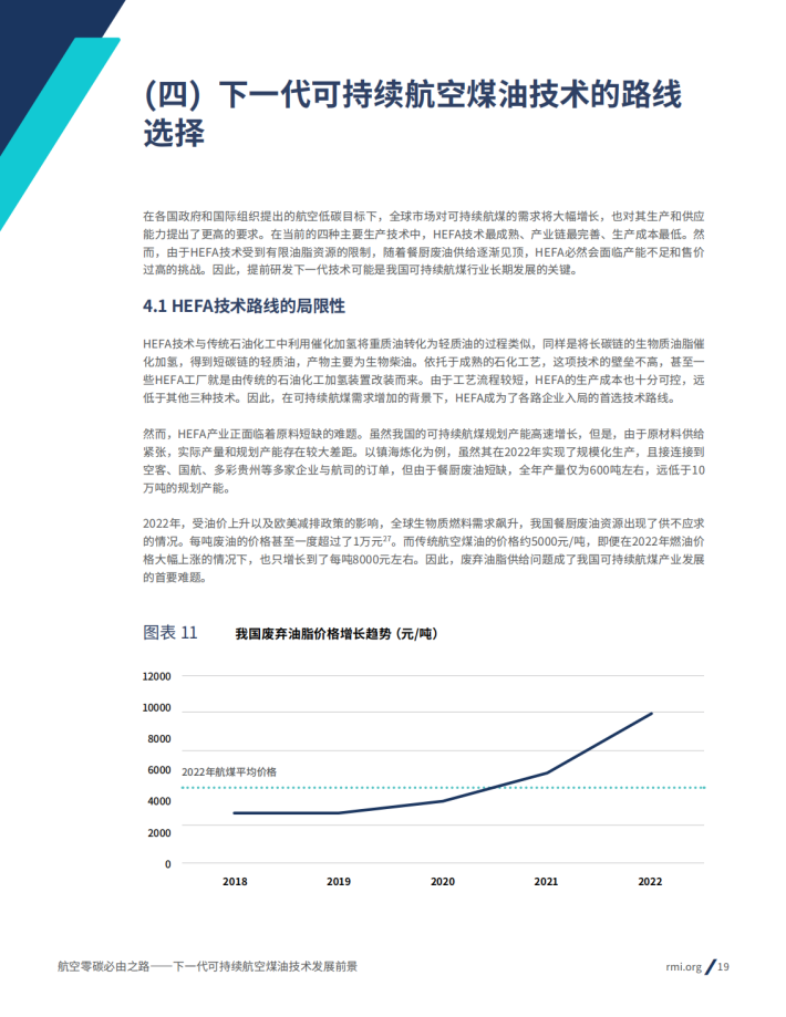 然而,受到当前可持续航煤生产技术的限制,原料供应和成本将成为我国可持续航煤产业加速发展的主要挑战。考虑到目前主流的第一代油脂加氢技术所需的“地沟油”原料在未来几年内将接近供应上限,可持续航煤产业即将面临原料短缺的困境。同时伴随着市场供需关系的变化,地沟油的价格也在快速增长,逼近了市场承受能力的极限。因此,为了扩大产能、降低成本,发展以秸秆等生物质为原料的下一代可持续航空煤油技术势在必行。