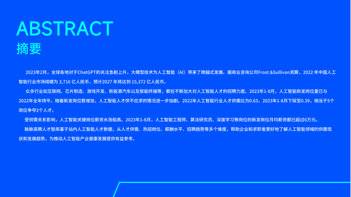 受供需关系影响,人工智能关键岗位薪资水涨船高。2023年1-8月,人工智能工程师、算法研究员、深度学习等岗位的新发岗位月均薪资都已超过6万元。脉脉高聘人才智库基于站内人工智能人才数据,从人才供需、热招岗位、薪酬水平、招聘趋势等多个维度,帮助企业和求职者更好地了解人工智能领域的供需现状和发展趋势,为推动人工智能产业健康发展提供有益参考。