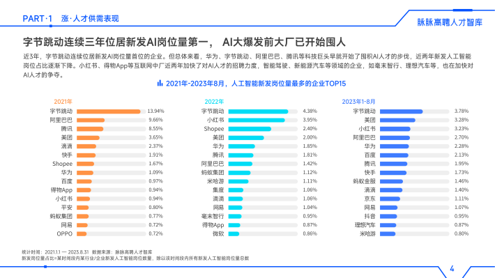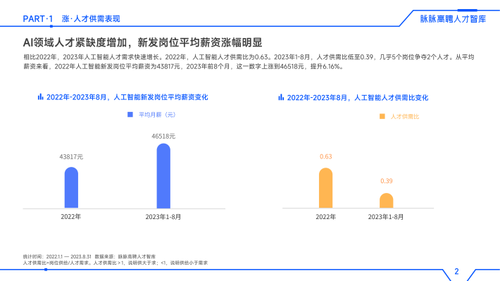 众多行业如互联网、芯片制造、游戏开发、新能源汽车以及智能终端等,都在不断加大对人工智能人才的招聘力度。2023年1-8月,人工智能新发岗位量已与2022年全年持平。随着新发岗位数增加,人工智能人才供不应求的情况进一步加剧。2022年人工智能行业人才供需比为0.63,2023年1-8月下探至0.39,相当于5个岗位争夺2个人才。