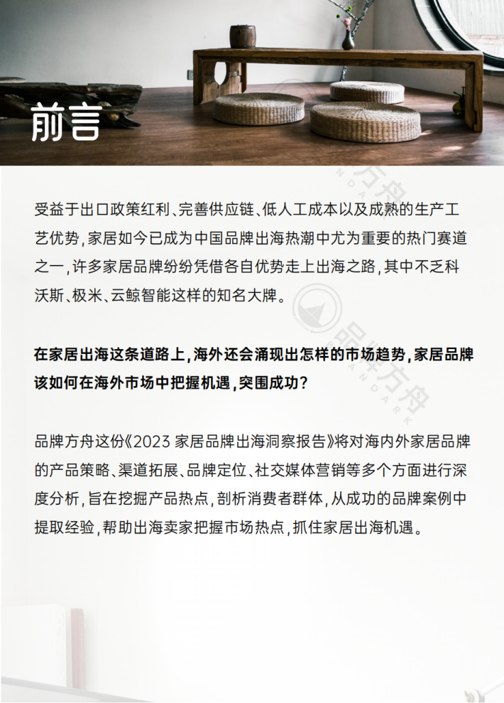 品牌方舟这份《2023家居品牌出海洞察报告》将对海内外家居品牌的产品策略、渠道拓展、品牌定位、社交媒体营销等多个方面进行深度分析,旨在挖掘产品热点,剖析消费者群体,从成功的品牌案例中提取经验,帮助出海卖家把握市场热点,抓住家居出海机遇。