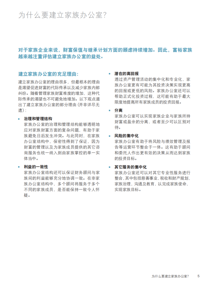 家族办公室可以是汇聚家族财富的家族公司,也可以是为这些客户提供金融服务而由家族保持决策权的公司或银行部门。许多家族办公室最初只是单一家族的办公室。这种情况下,家族是该办公室的所有者,专享其服务。为了避免单一家族承担太高的经营成本,这些家族通常会决定为其他家族提供他们的家族办公室服务。这时,单一家族办公室就变成了多家族办公室。