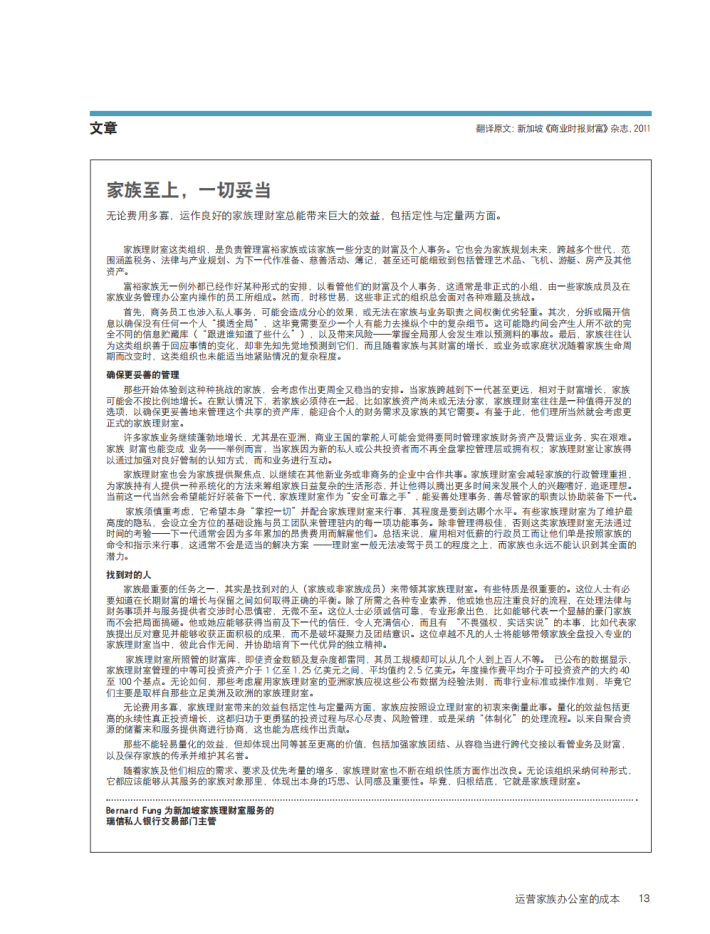单一家族办公室为该家族提供个性化的服务,且其成本也相对较高,管理的家族财富通常至少为一亿美元。然而,根据回报期望值及目标所计算出的财富管理最小值,以及家族办公室产生的成本,则更能说明问题。这说明对于一个家族办公室来说,管理的家族财富没有明显的下限。家族办公室的成本,及其目标回报值,必须能够通过所选的资产配置和结构来实现。
