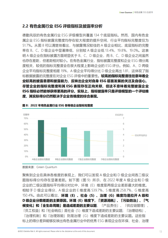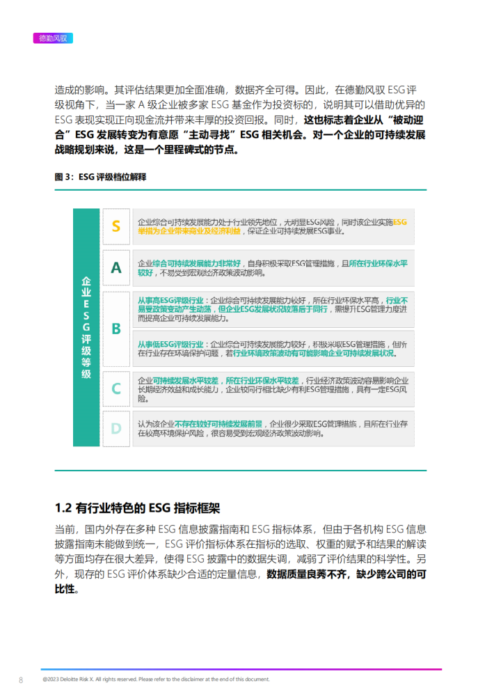 ESG(Environmental,Social and Governance),即环境、社会与公司治理,是衡量一家公司社会责任感的重要指标,评价企业在环境、社会和治理绩效方面的表现。始于2005年时任联合国秘书长安南牵头推出全球经济研究报告《在乎者赢》,ESG已从一个先锋理念逐渐转换为极具必要性和实际意义的投资风向标,成为各国主流投资机构投资实践中的重要考量因素。自2020年我国提出“碳达峰、碳中和“目标以来,国内投资机构也紧跟国际主流,将环境、社会和公司治理绩效纳入投资指标考量。因此,于企业而言,提升ESG表现不是额外成本支出,而是提升盈利能力和可持续发展能力的重要举措;于金融机构而言,发展ESG评级的目的不是为了在业务中筛选掉低评级的公司,而是为了更好地帮助低评级公司成长,促进企业及全社会的可持续发展。在国内双碳行动势在必行、国外负责任投资风头正盛的当下,对ESG的深度解读已成为企业可持续发展、投资者成功投资的必经之路。根据德勤风驭自2020年起开展的全A股上市公司ESG评级数据,2022年全A股2700+家上市公司中,共有400+家上市公司ESG评级在A级(含)以上,占比9.1%。因此,国内企业的ESG表现提升任重而道远。