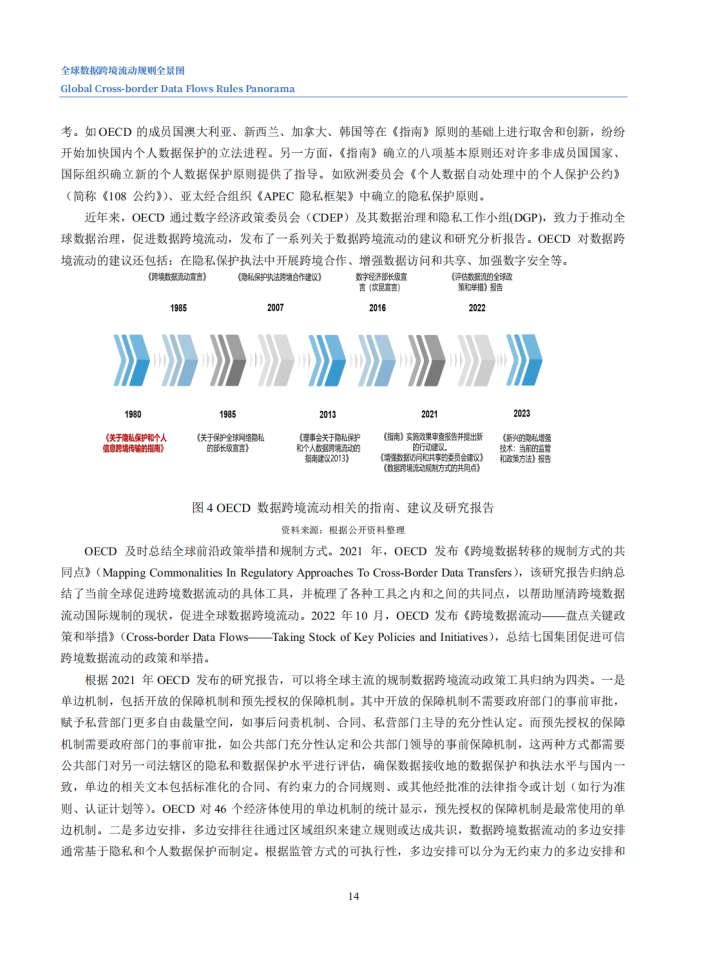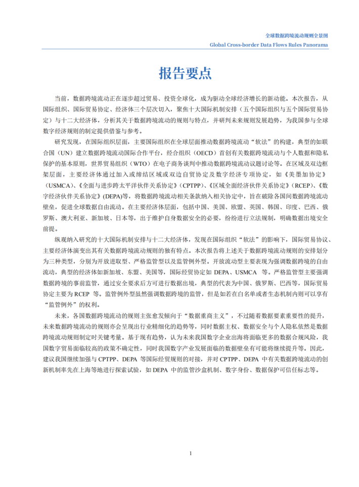 当前,数据跨境流动正在逐步超过贸易、投资全球化,成为驱动全球经济增长的新动能。本次报告,从国际组织、国际贸易协定、经济体三个层次切入,聚焦十大国际机制安排(五个国际组织与五个国际贸易协定)与十二大经济体,分析其关于数据跨境流动的规则与特点,并研判未来规则发展趋势,为我国参与全球数字经济规则的制定提供借鉴与参考。