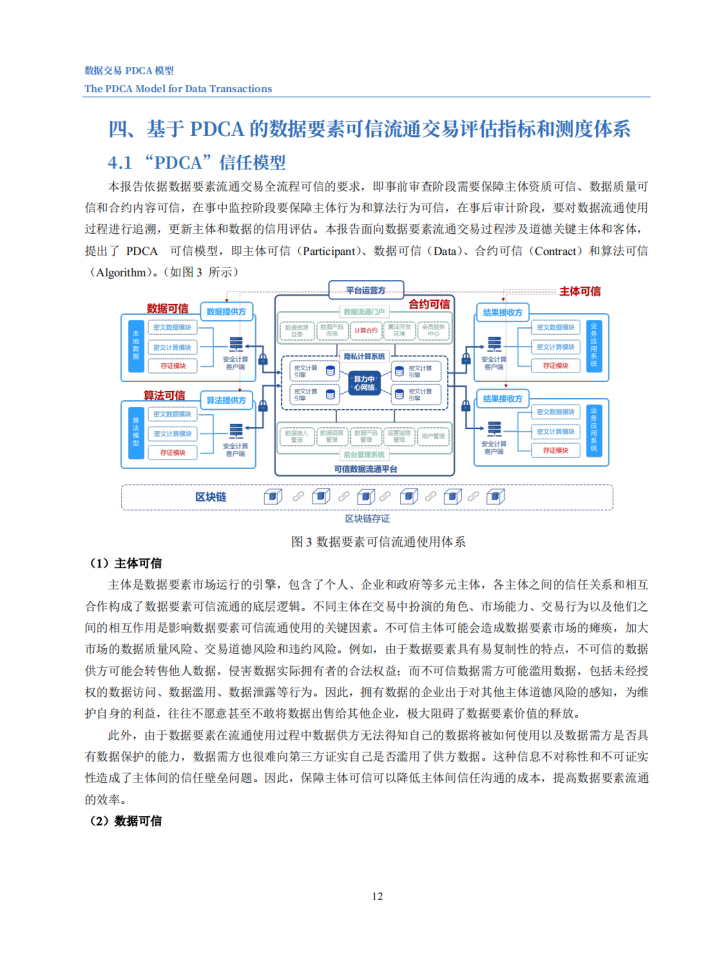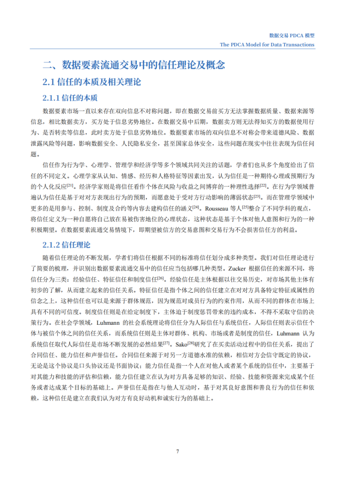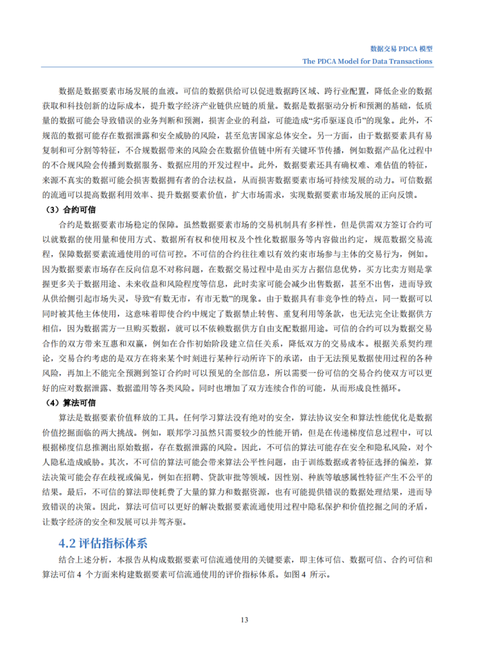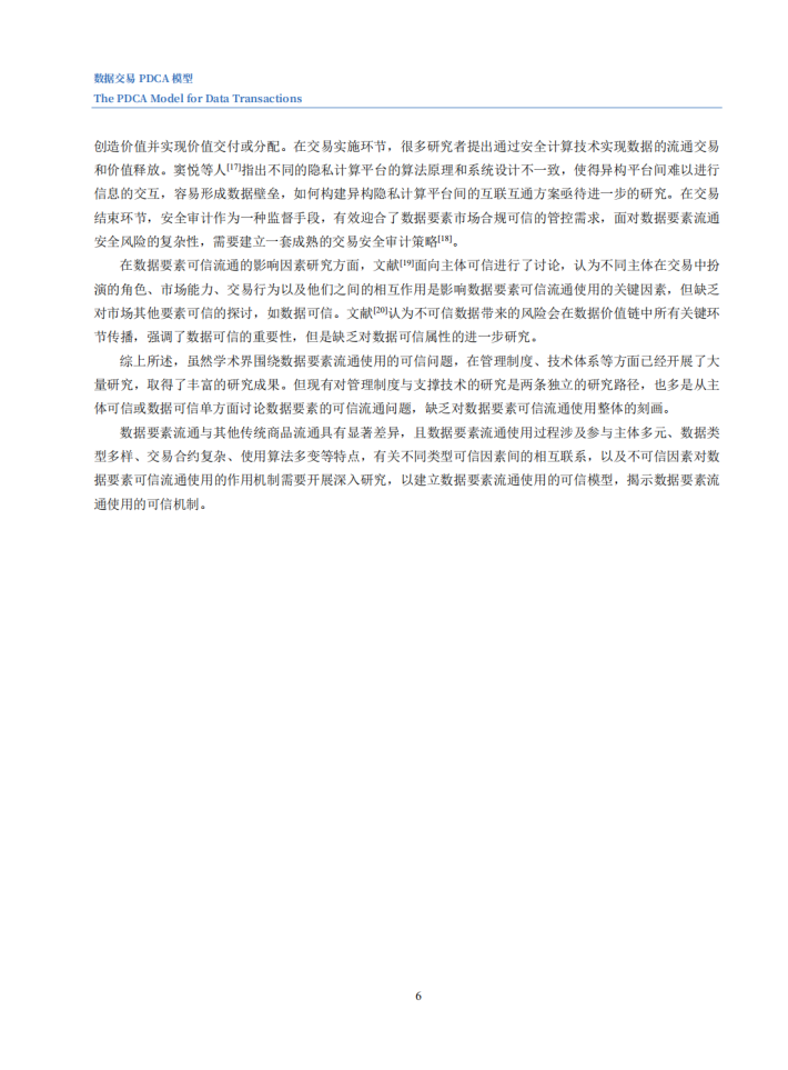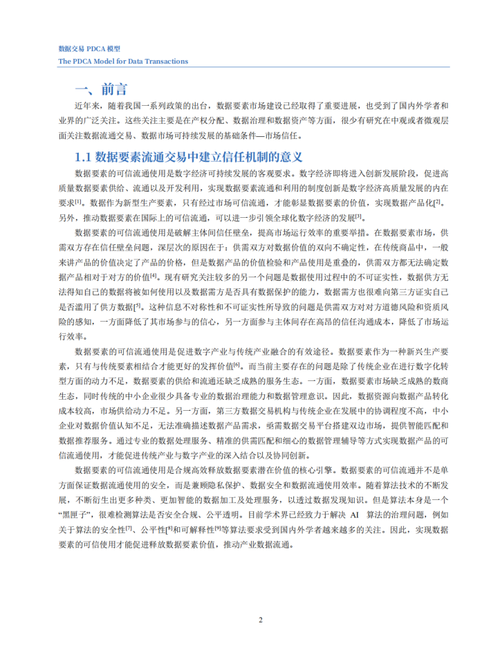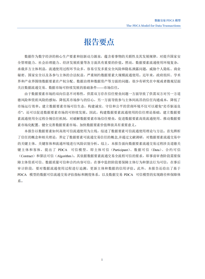 本报告以数据要素如何高效可信流通使用为主线,综述了数据要素可信流通使用理论与方法。首先辨析了信任的概念和相关理论,界定了数据要素可流通交易信任的概念,并通过文献调研,对数据要素流通交易中的关键主体、关键客体和流通环境进行风险识别分析。综上,本报告面向数据要素流通交易过程涉及道德关键主体和客体,提出了PDCA可信模型,即主体可信(Participant)、数据可信(Data)、合约可信(Contract)和算法可信(Algorithm)。其依据数据要素流通交易全流程可信的要求,即事前审查阶段需要保障主体资质可信、数据质量可信和合约内容可信,在事中监控阶段要保障主体行为和算法行为可信,在事后审计阶段,要对数据流通使用过程进行追溯,更新主体和数据的信用评估。此外,本报告还给出了基于PDCA模型的数据可信流通交易评估指标和测度体系,以及数据交易PDCA可信模型的实现路径和保障体系。