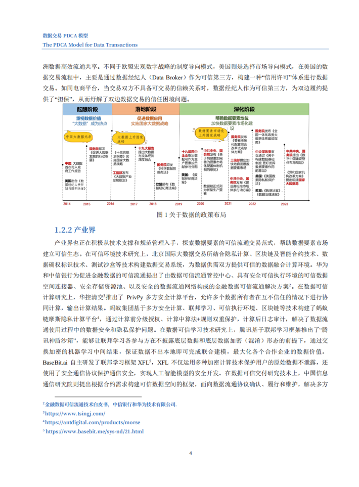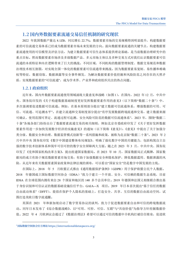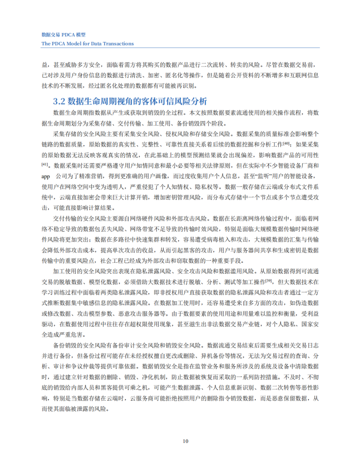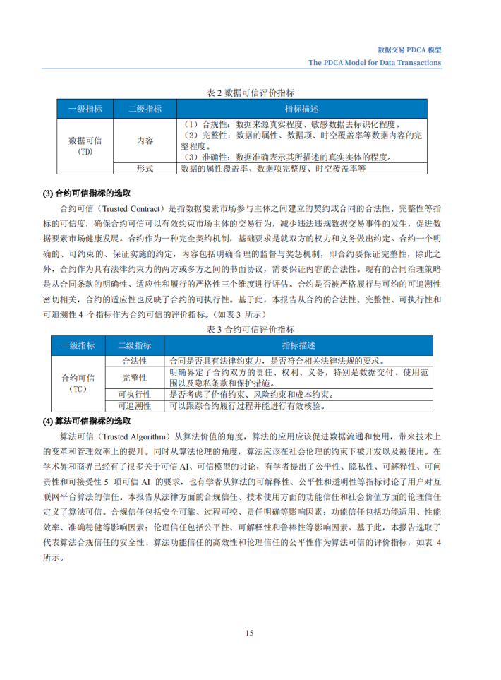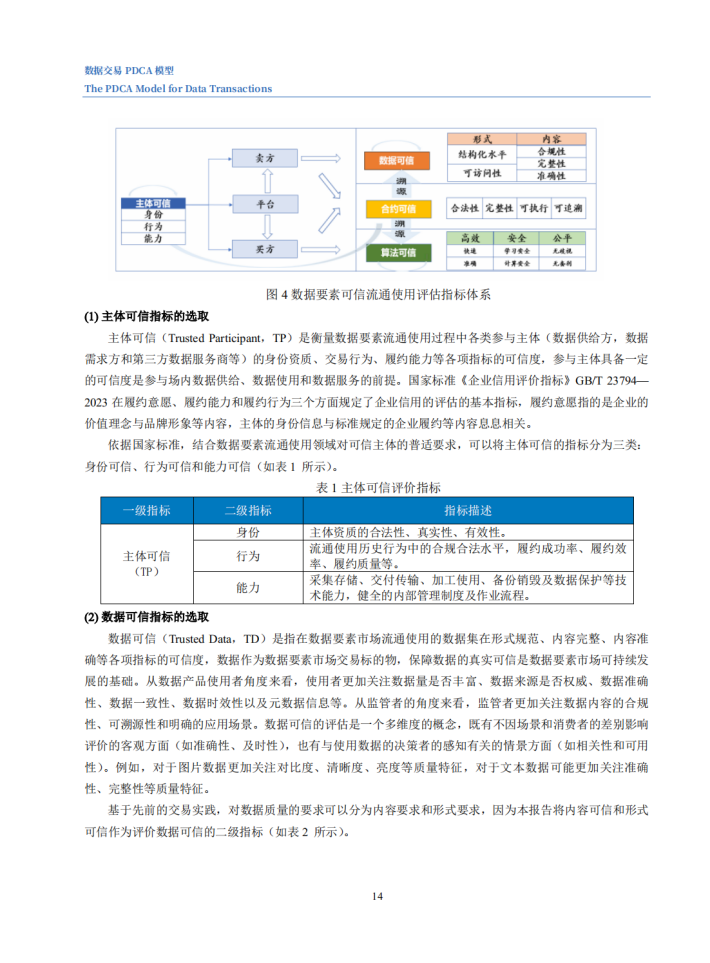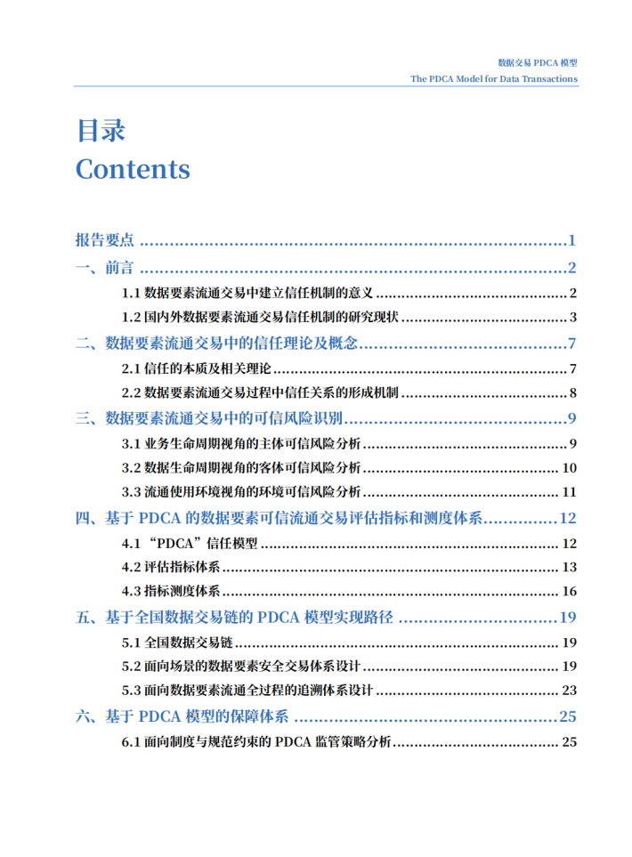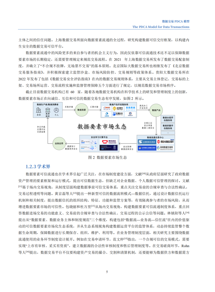 本报告以数据要素如何高效可信流通使用为主线,综述了数据要素可信流通使用理论与方法。首先辨析了信任的概念和相关理论,界定了数据要素可流通交易信任的概念,并通过文献调研,对数据要素流通交易中的关键主体、关键客体和流通环境进行风险识别分析。综上,本报告面向数据要素流通交易过程涉及道德关键主体和客体,提出了PDCA可信模型,即主体可信(Participant)、数据可信(Data)、合约可信(Contract)和算法可信(Algorithm)。其依据数据要素流通交易全流程可信的要求,即事前审查阶段需要保障主体资质可信、数据质量可信和合约内容可信,在事中监控阶段要保障主体行为和算法行为可信,在事后审计阶段,要对数据流通使用过程进行追溯,更新主体和数据的信用评估。此外,本报告还给出了基于PDCA模型的数据可信流通交易评估指标和测度体系,以及数据交易PDCA可信模型的实现路径和保障体系。