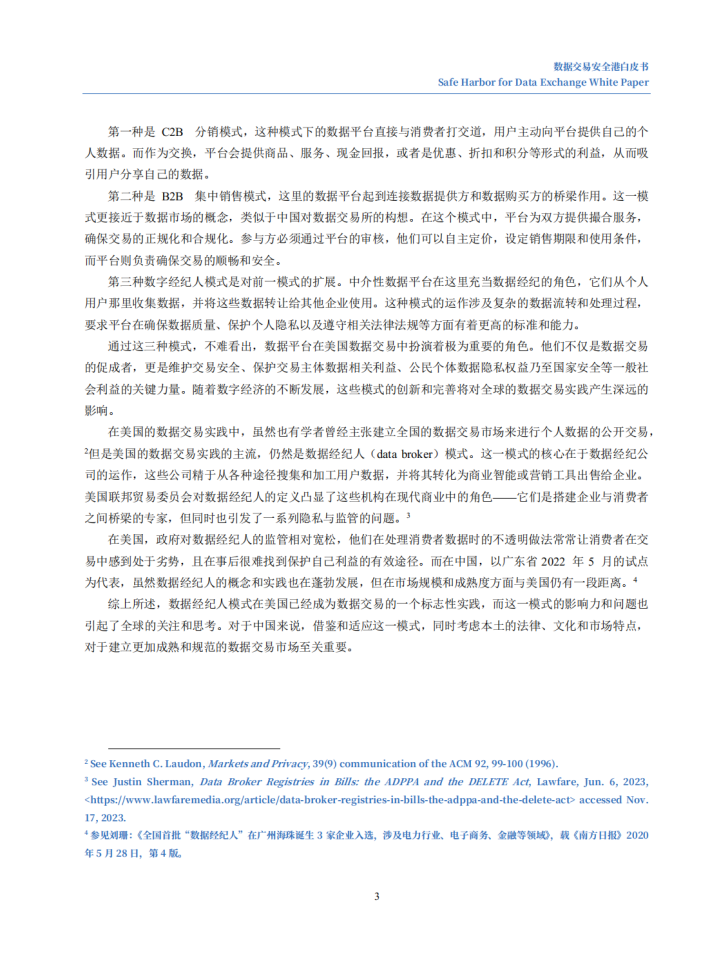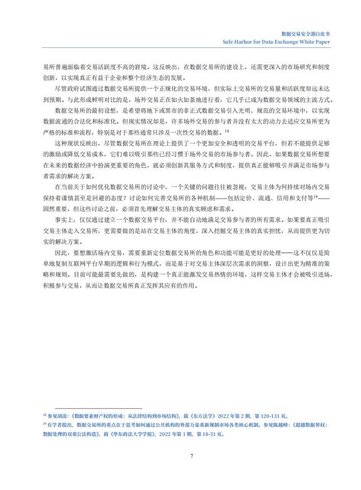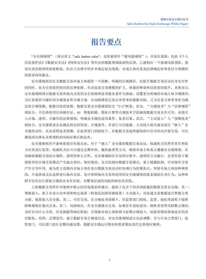 安全港规则旨在为数据交易市场主体提供一个清晰、明确的合规路径,在提升数据交易活动自身安全性的同时,也为交易提供相应的法律保障,从而促进交易规模的扩大、体量的释放和活跃度的提升。具体而言,安全港规则将以数据交易所场内交易的安全保障和技术服务条件为基础,设置更为明确的市场主体合规路径,为后者提供可操作的合规要求和合规方案,从而既降低交易自身带来的数据风险,又为交易主体带来更为确定的合规预期。根据目前的设想,数据交易安全港规则包含“2+2”框架。首先,“合规技术”与“法律规则”相结合,不仅将使用区块链存证、AI智能检测、隐私计算等合规技术手段确保数据交易安全可信,也将引入合规、透明、可操作的法律规则,明确安全港的适用条件、免责后果。其次,“主动投入”与“预期免责”相结合,安全港要求企业满足特定的资质、合规条件,并进行可信披露,主动投入相关成本进行“驶入”安全港的动作,从而获得免责预期:在监管部门的授权下、在数据交易场所建构的可信空间内开展交易,可以避免因为事先未曾预料的风险而事后被追责。