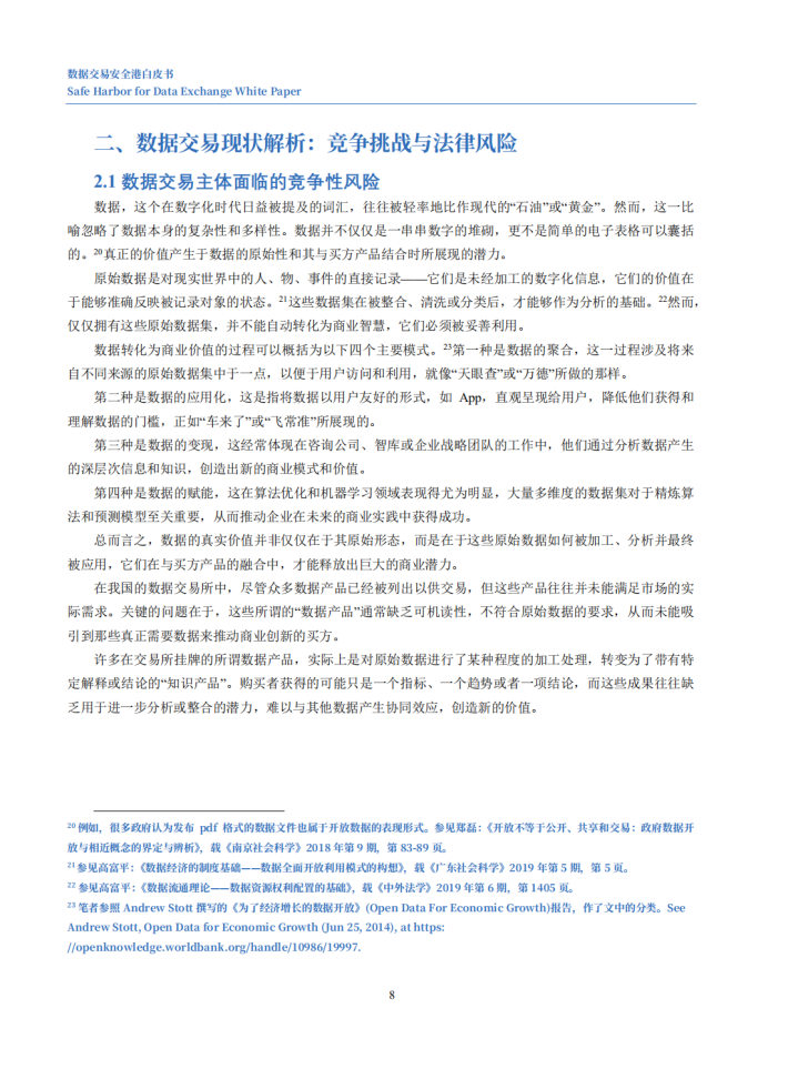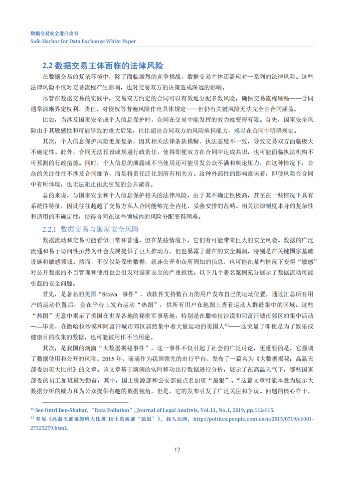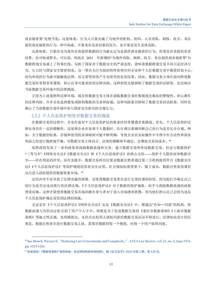 “安全港规则”(译自英文“safe harbor rules”,也常被译作“避风港规则”)。目前在我国,包括《个人信息保护法》《数据安全法》《网络安全法》等在内的数据领域基础性法律,已建构出一个强调风险预防、损害问责的原则性制度框架。但由于法律中的许多规定较为笼统,市场主体对更高法律确定性和责任可预期性的需求尚待满足。