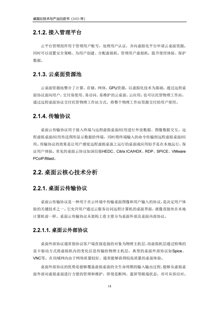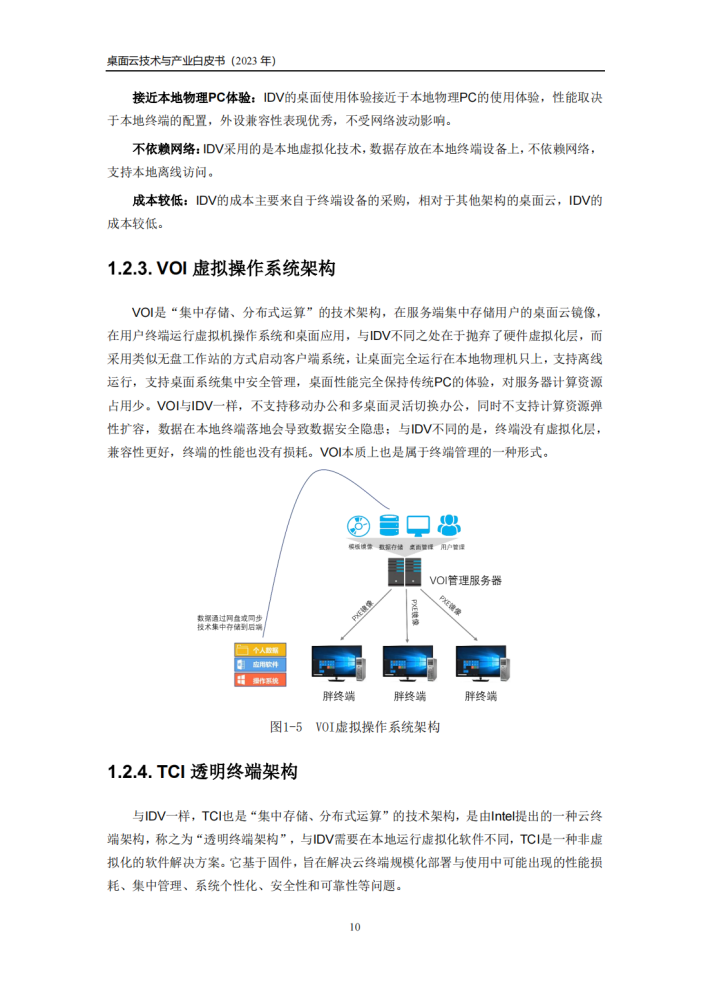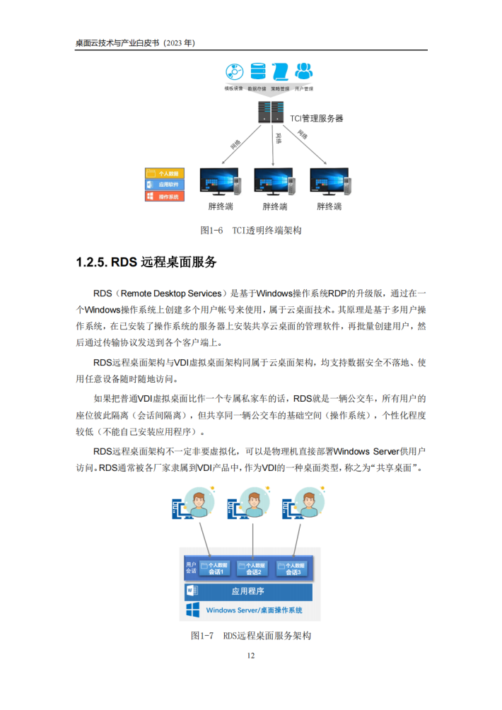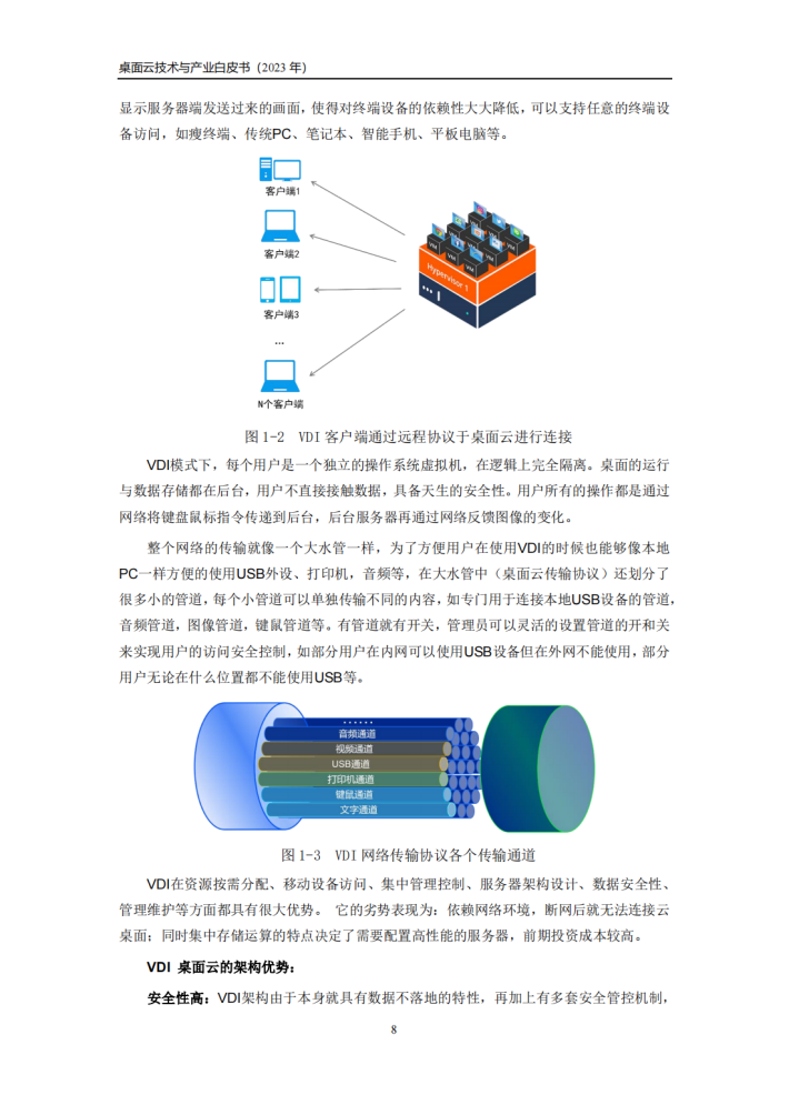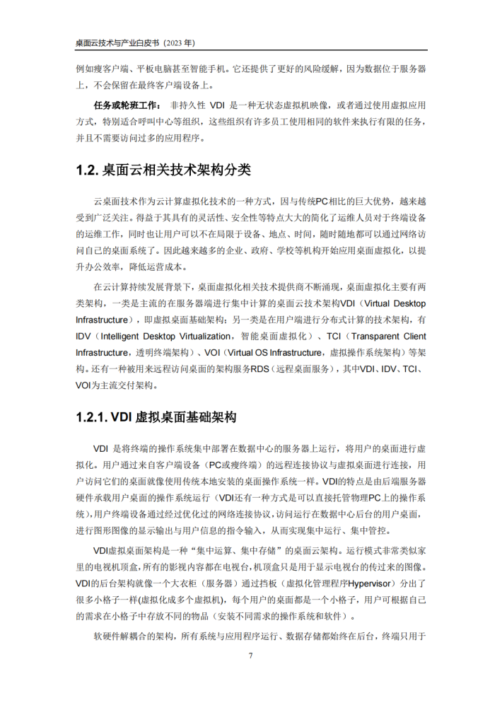 在云计算持续发展背景下,桌面虚拟化相关技术提供商不断涌现,桌面虚拟化主要有两类架构,一类是主流的在服务器端进行集中计算的桌面云技术架构VDI(Virtual DesktopInfrastructure),即虚拟桌面基础架构;另一类是在用户端进行分布式计算的技术架构,有IDV(Intelligent Desktop Virtualization,智能桌面虚拟化)、TCl(Transparent ClientInfrastructure,透明终端架构)、VOl(Virtual OS Infrastructure,虚拟操作系统架构)等架构。还有一种被用来远程访问桌面的架构服务RDS(远程桌面服务),其中VDI、IDV、TCl、VOl为主流交付架构。