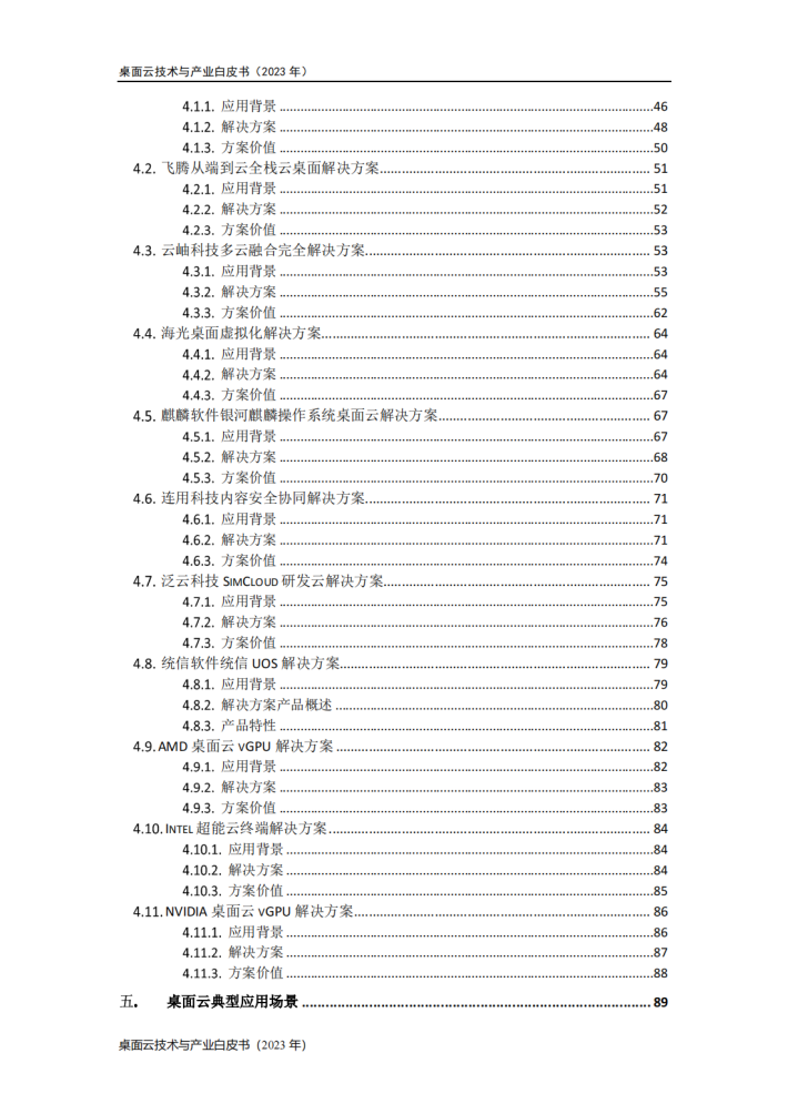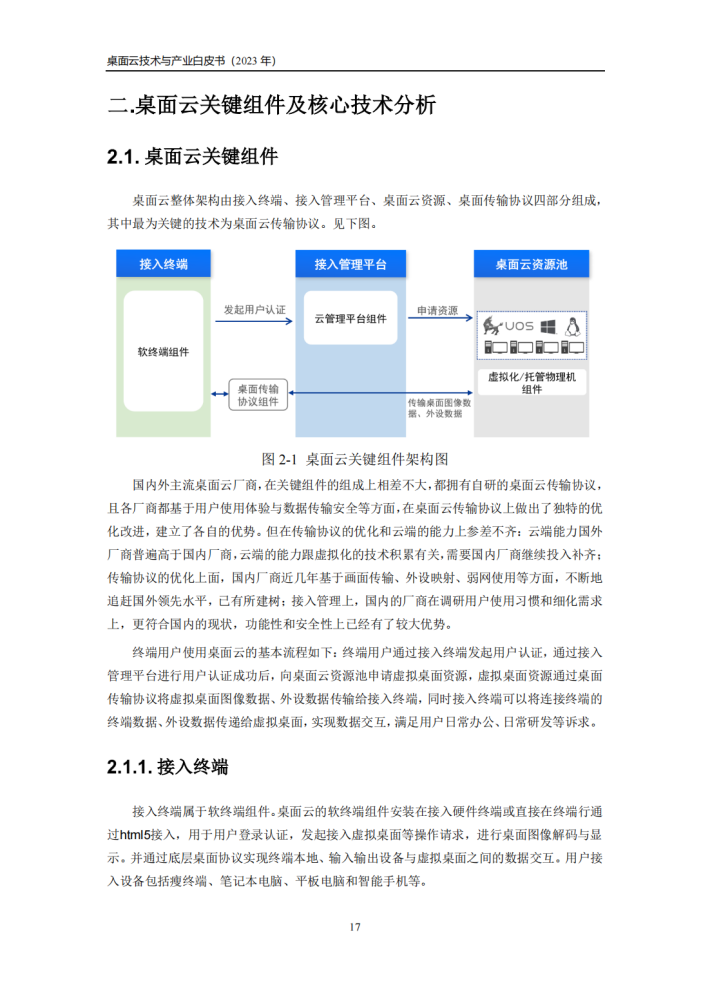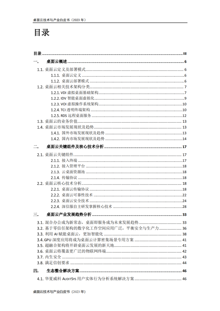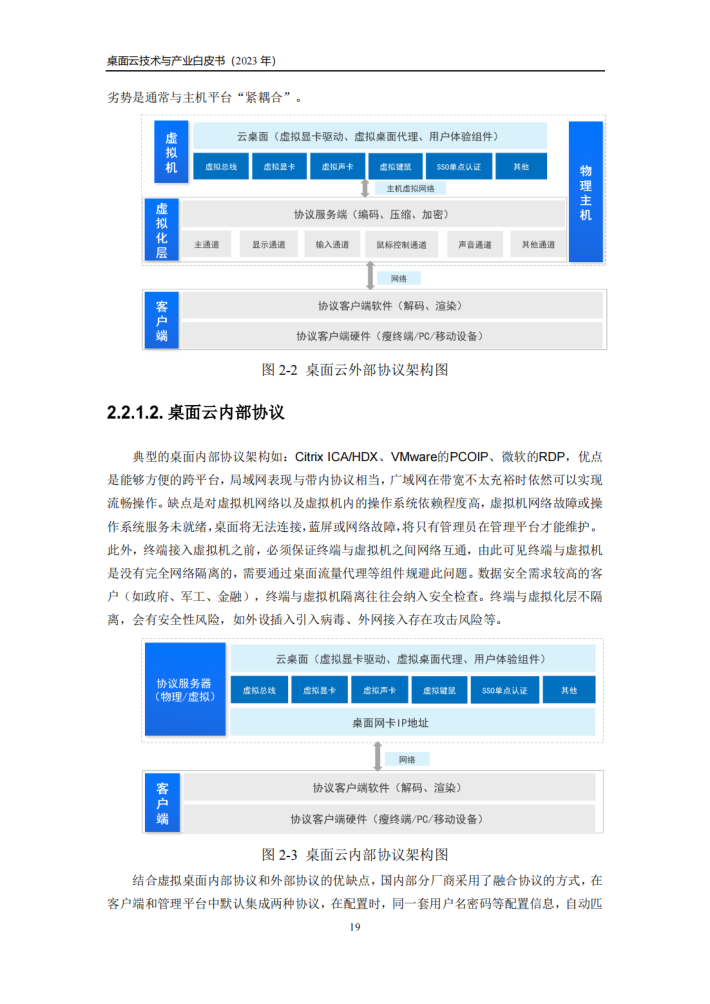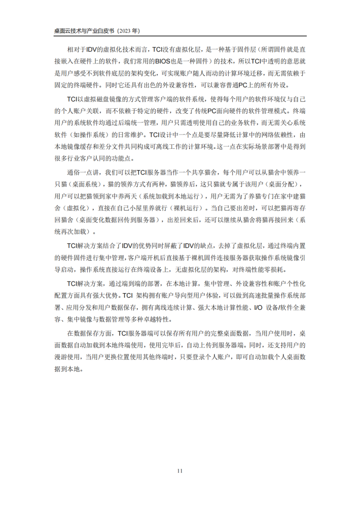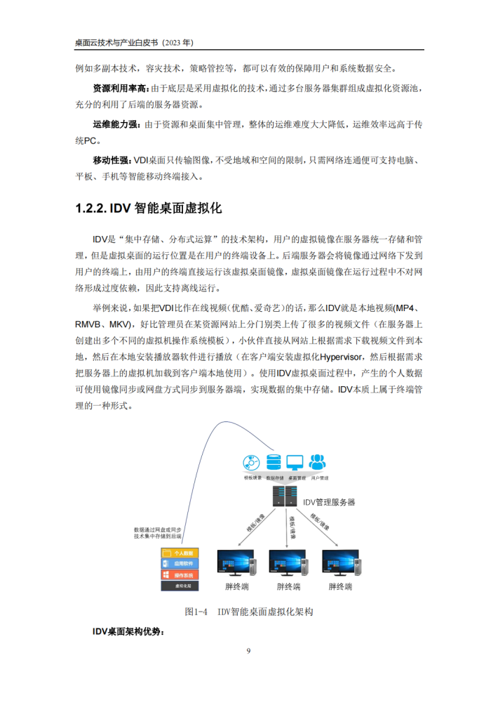 在云计算持续发展背景下,桌面虚拟化相关技术提供商不断涌现,桌面虚拟化主要有两类架构,一类是主流的在服务器端进行集中计算的桌面云技术架构VDI(Virtual DesktopInfrastructure),即虚拟桌面基础架构;另一类是在用户端进行分布式计算的技术架构,有IDV(Intelligent Desktop Virtualization,智能桌面虚拟化)、TCl(Transparent ClientInfrastructure,透明终端架构)、VOl(Virtual OS Infrastructure,虚拟操作系统架构)等架构。还有一种被用来远程访问桌面的架构服务RDS(远程桌面服务),其中VDI、IDV、TCl、VOl为主流交付架构。