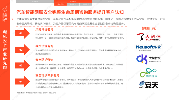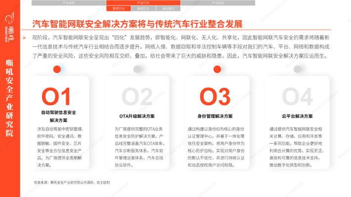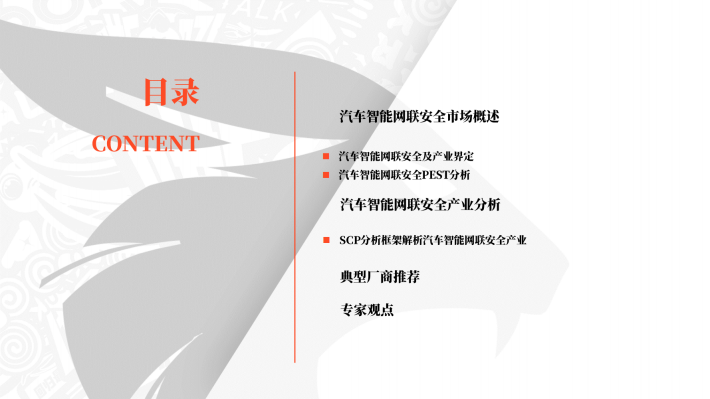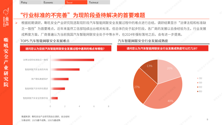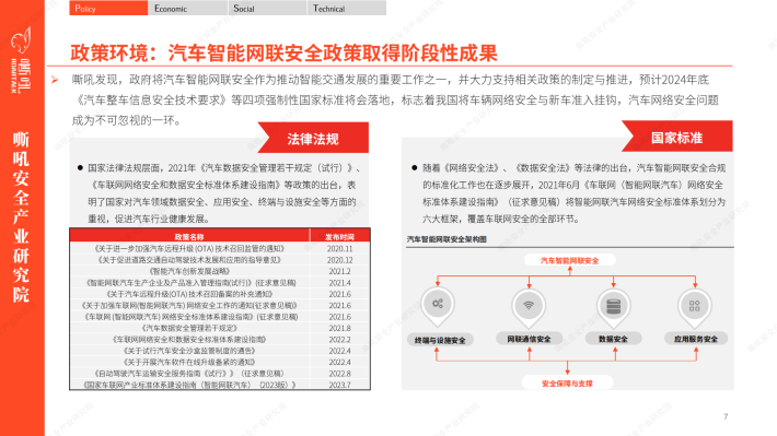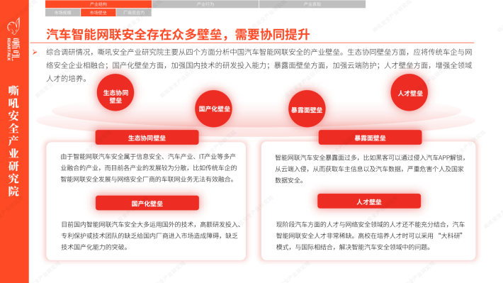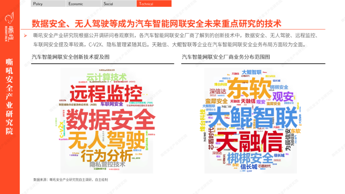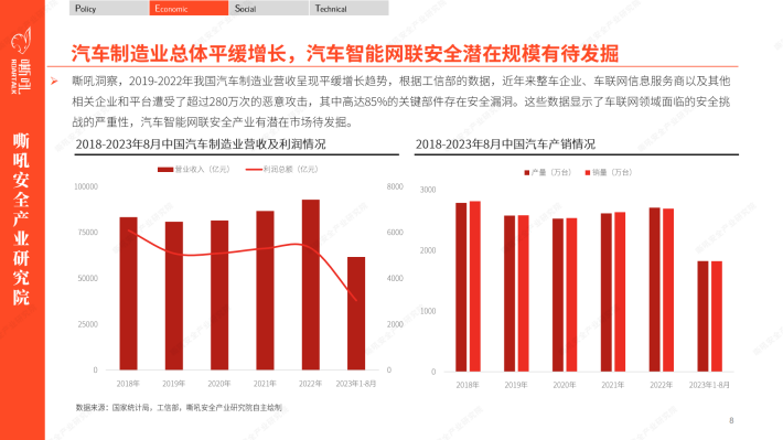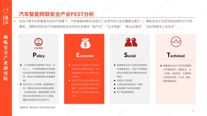 在当今数字化和智能化的时代背景下,汽车智能网联安全成为了全球汽车行业的重要议题之一。嘶吼安全产业研究院运用PEST分析模型,洞察到现阶段汽车智能网联安全的四大关键词“国产化” “立法突破” “商业化落地” “自动驾驶无人化安全”。