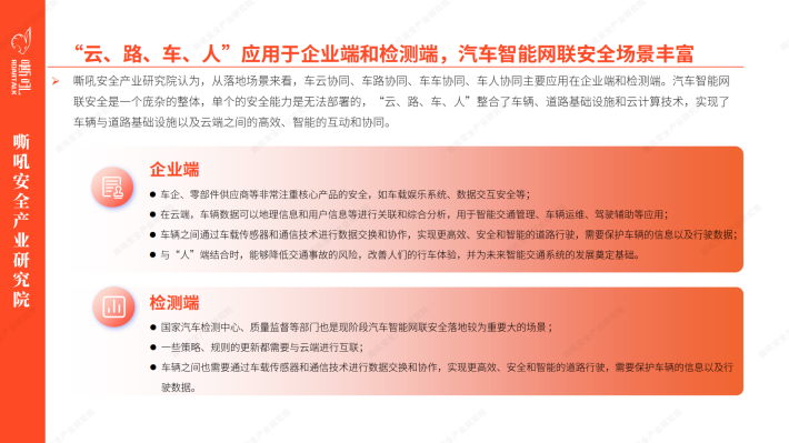 嘶吼安全产业研究院认为,从落地场景来看,车云协同、车路协同、车车协同、车人协同主要应用在企业端和检测端。汽车智能网联安全是一个庞杂的整体,单个的安全能力是无法部署的,“云、路、车、人”整合了车辆、道路基础设施和云计算技术,实现了车辆与道路基础设施以及云端之间的高效、智能的互动和协同。