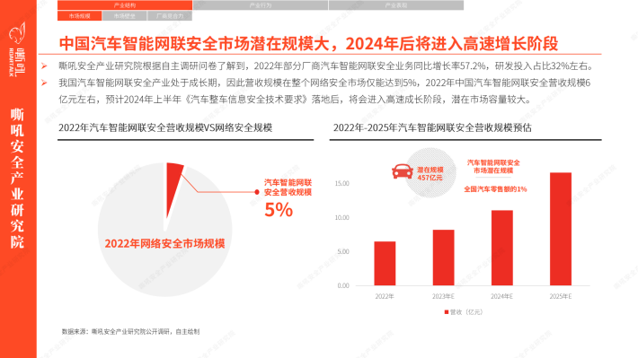 嘶吼发现,政府将汽车智能网联安全作为推动智能交通发展的重要工作之一,并大力支持相关政策的制定与推进,预计2024年底《汽车整车信息安全技术要求》等四项强制性国家标准将会落地,标志着我国将车辆网络安全与新车准入挂钩,汽车网络安全问题成为不可忽视的一环。