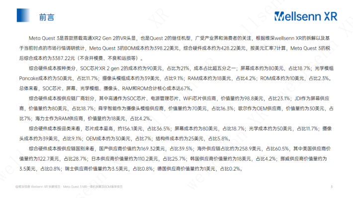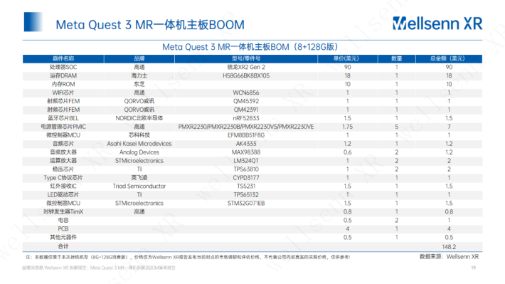 综合硬件成本按种类分,SOC芯片XR2的成本约为80美元,占比为29%,成本占比接近三成;屏幕成本约为38美元,占比14%;摄像头模组成本约为20美元,占比7%;RAM成本约为18美元,占比6%;ROM成本约为12美元,占比4%。总体来看,SOC芯片、屏幕、摄像头、RAM和ROM合计核心成本达168美元,合计占比60%。