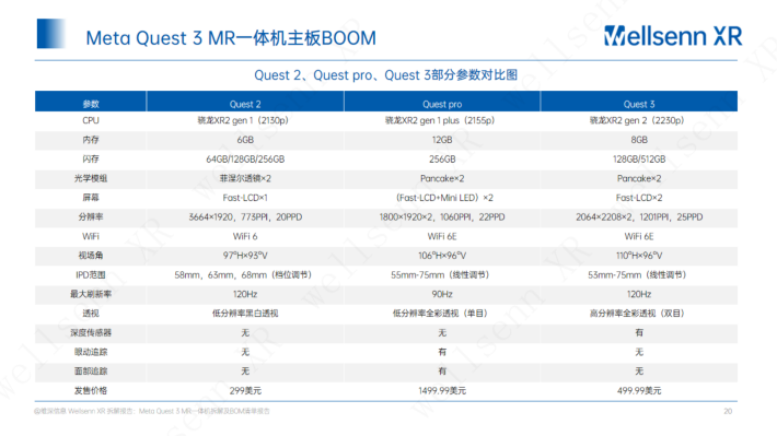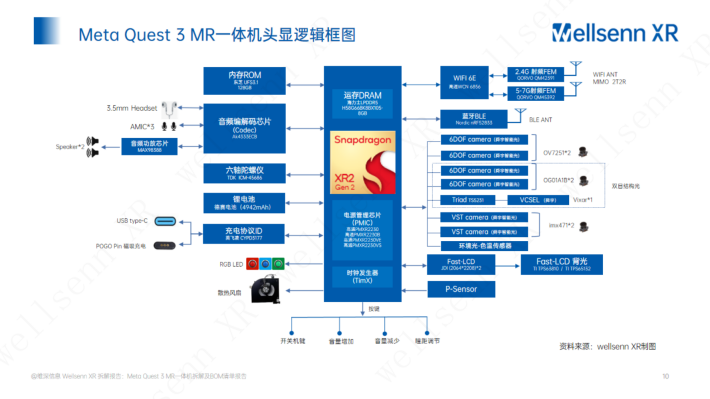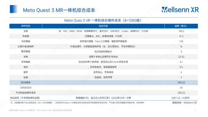Meta Quest 2(原名Oculus Quest 2)是Meta于2020年9月发布的一款VR一体机,这款产品一经发布便受到业内的广泛关注,根据维深wellsennXR的拆解以及基于当前时点的市场行情调研统计,Meta Quest 2的BOM成本约为264.2美元,综合硬件成本约为279.2美元,按美元汇率6.7计算,Meta Quest 2税后综合成本约为2114元(不含开模费、不良和运损等)。