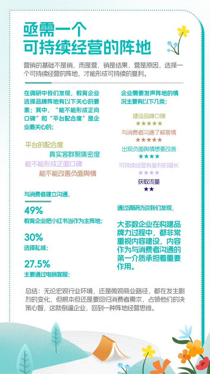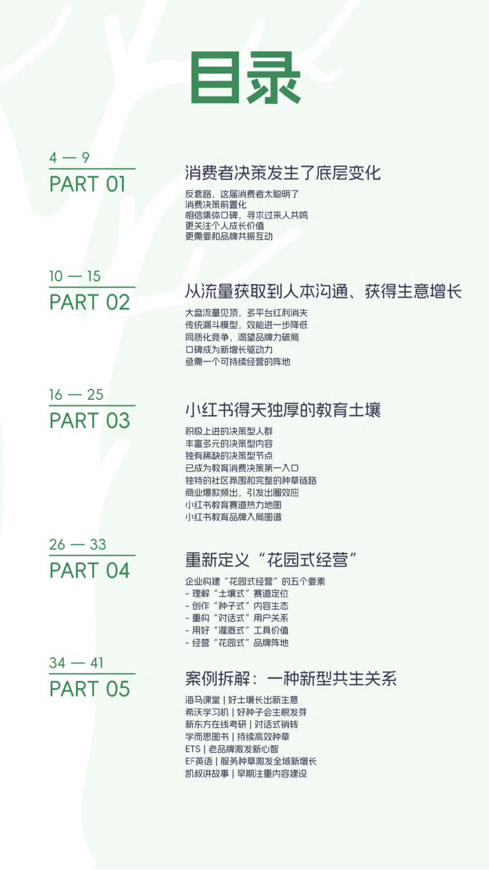 我们通过数千份行业数据调研以及一线深度走访,总结出了一套小红书教育行业营销密码,定义为「花园式经营」,努力尝试还原真实的动作路径,并抽象出具有可夏制性的因果关系。