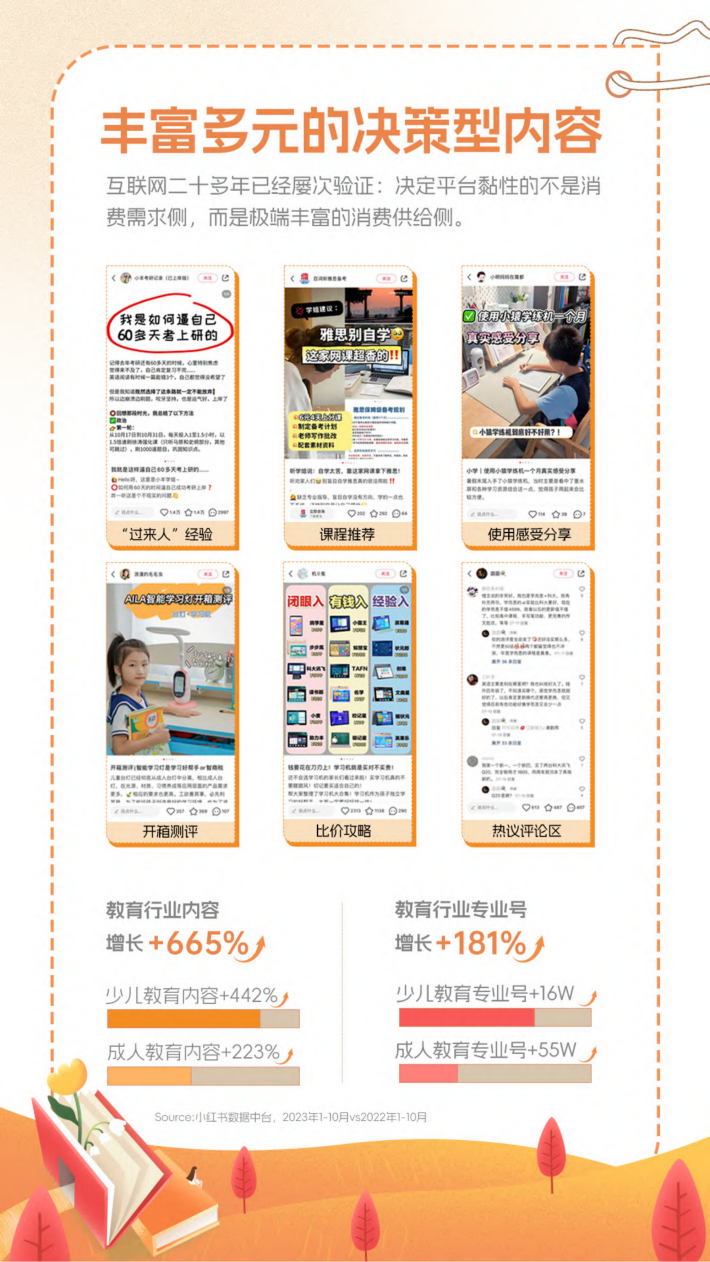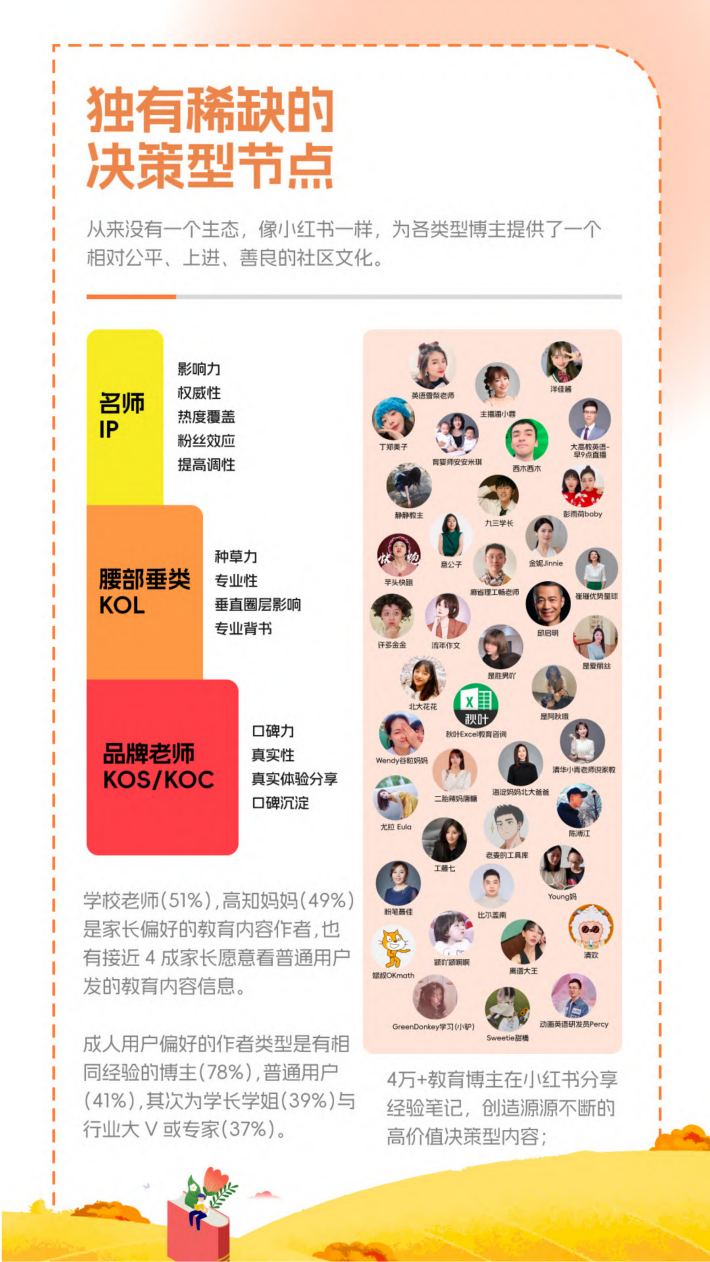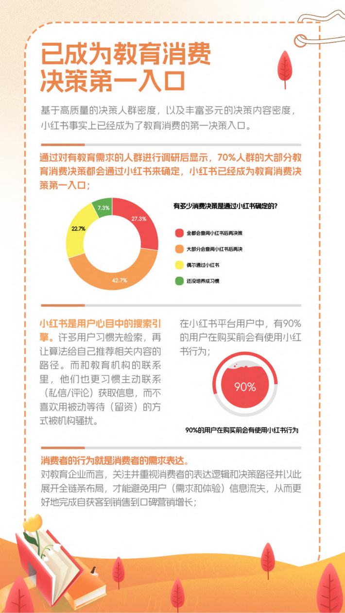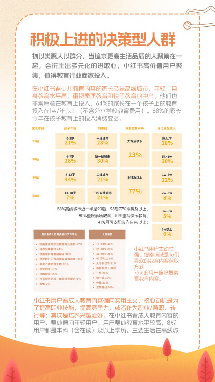 小红书凭借着其生产与分享「有价值内容」的社区定位,在过去几年里增长迅猛,热爱自我提升的决策型人群,丰富多元的决策型内容,令其成为教育消费决