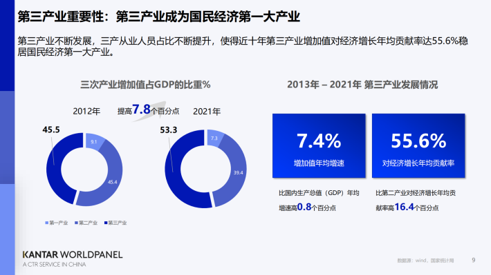 第三产业不断发展,三产从业人员占比不断提升,使得近十年第三产业增加值对经济增长年均贡献率达55.6%稳居国民经济第一大产业。