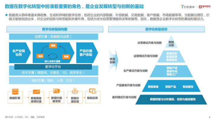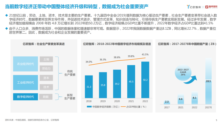 21世纪以前,劳动、土地、资本、技术是主要的生产要素。十九届四中全会(2019)增列数据为核心驱动生产要素,社会生产要素变革带社会进入数字经济时代,数据要素将发挥主导作用,并促进技术进步、管理方式变革、知识创造与转化,引领传统生产要素实现新发展。经过多年发展,数字经济增加值规模由2008年的4.8万亿增长到2022年的50.2万亿,数字经济规模占GDP比重不断提升,2022年数字经济占GDP比重达到41.5%由于人口众多、消费市场活跃,中国的数据体量和增速都非常可观。数据显示,2022年我国数据数据产量达8.1ZB,同比增长22.7%,数据产量位居世界第二。因此,数据成为社会和企业发展的重要资产。