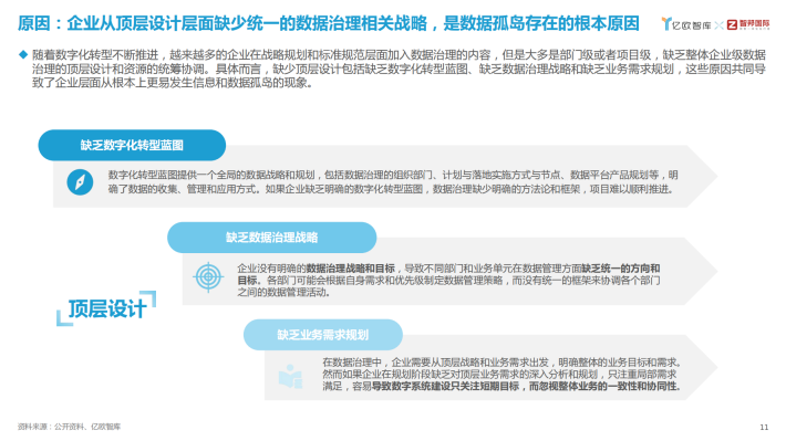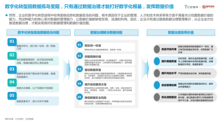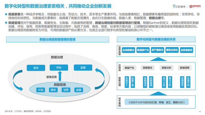 数据管理是对于数据质量、数据安全、主数据、元数据等的管理,数据治理则是对数据管理进行管理。根据Gartner的定义,数据治理是指在数据创建、评估、使用、控制等数据管理活动过程中,包括了流程、角色、制度、标准等方面内容,以保障组织能够通过高效地使用数据实现其目标。数据治理是将数据转变为可信、可用的数据资产的必要方法,也是企业进行数字化转型的基础和核心环节之一。