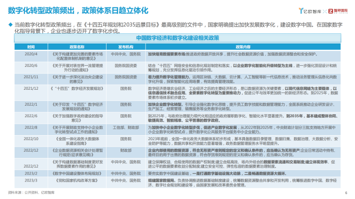 数字化转型的发展步骤是由点到体逐渐扩张,从信息化到智能化逐渐加深。目前,大多企业处于应用数字化到全面系统化的过渡阶段。随着我国对于数字化转型的重视程度日益提高,我国企业迎来数字化转型变革的攻坚阶段,将全面评估并改造其业务流程、组织结构和技术平台,以适应数字化时代对于全局数据可视化和分析的需求。