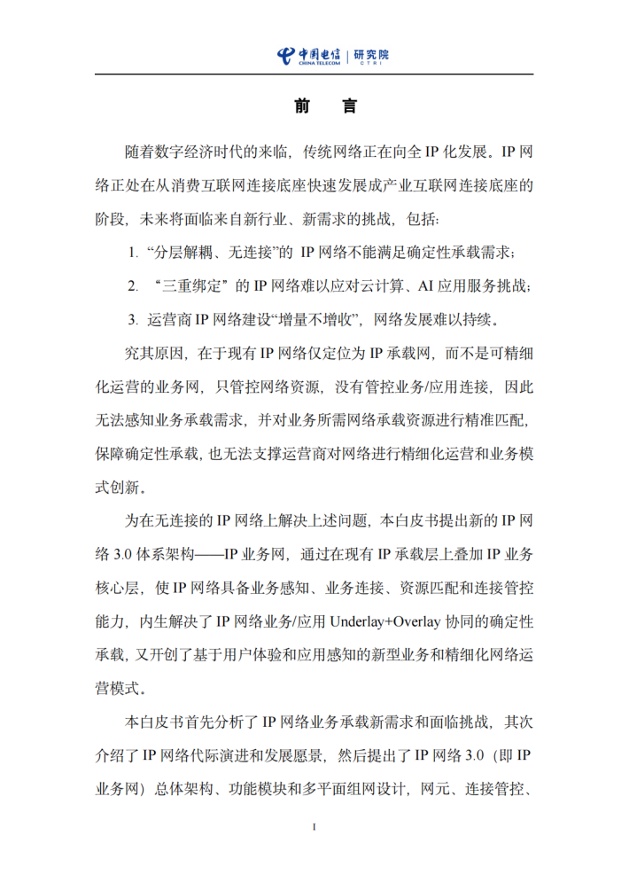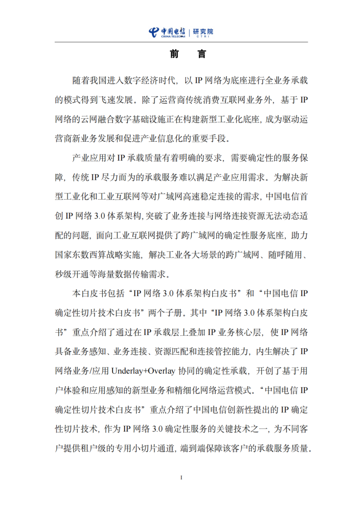 本白皮书包括“IP网络3.0体系架构白皮书”和“中国电信IP确定性切片技术白皮书”两个子册。其中“IP网络3.0体系架构白皮书”重点介绍了通过在IP承载层上叠加IP业务核心层,使IP网络具备业务感知、业务连接、资源匹配和连接管控能力,内生解决了IP网络业务/应用Underlay+Overlay协同的确定性承载,开创了基于用户体验和应用感知的新型业务和精细化网络运营模式。“中国电信IP确定性切片技术白皮书”重点介绍了中国电信创新性提出的IP确定性切片技术,作为IP网络3.0确定性服务的关键技术之一,为不同客户提供租户级的专用小切片通道,端到端保障该客户的承载服务质量。