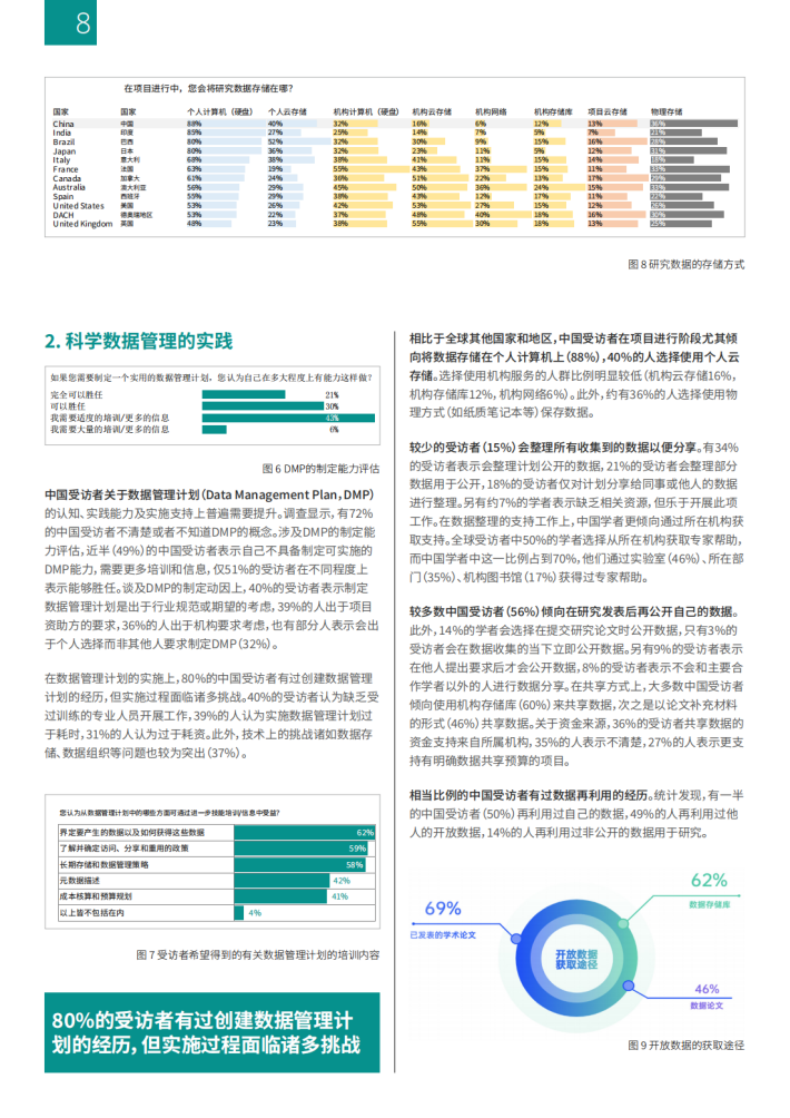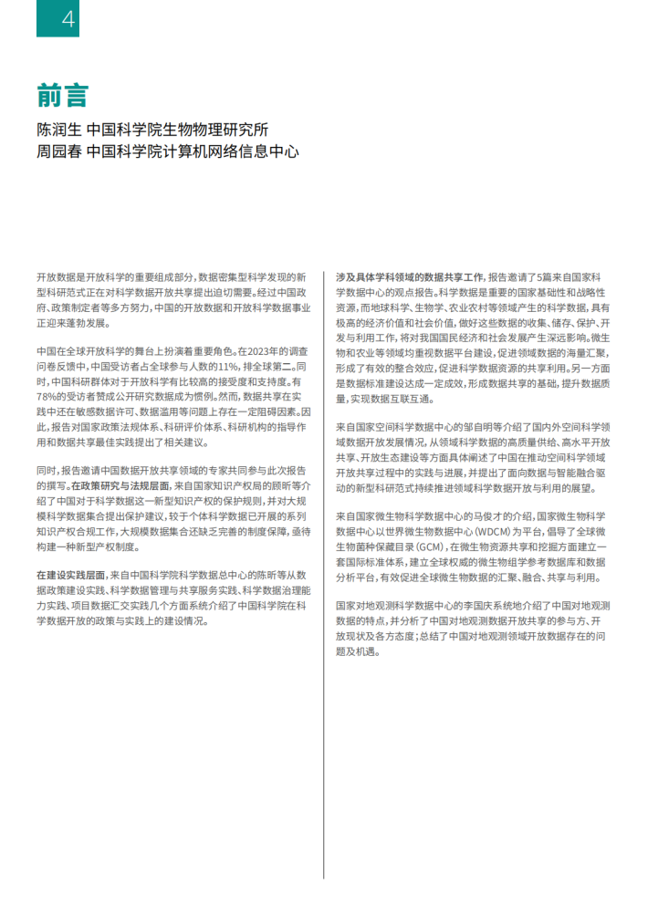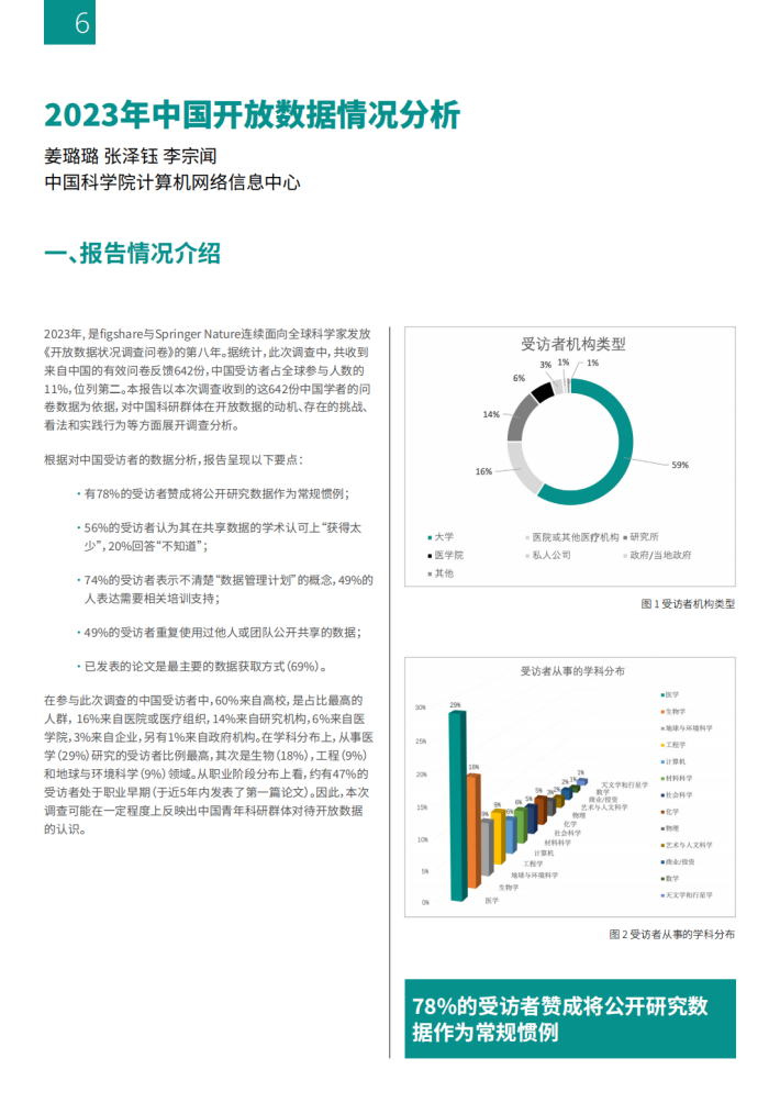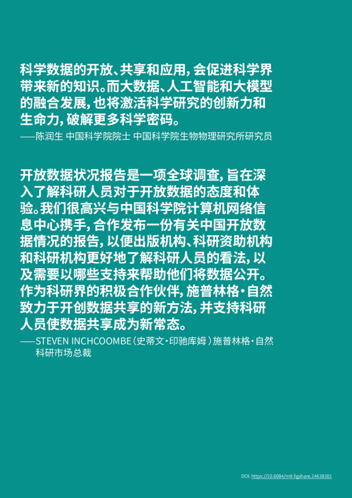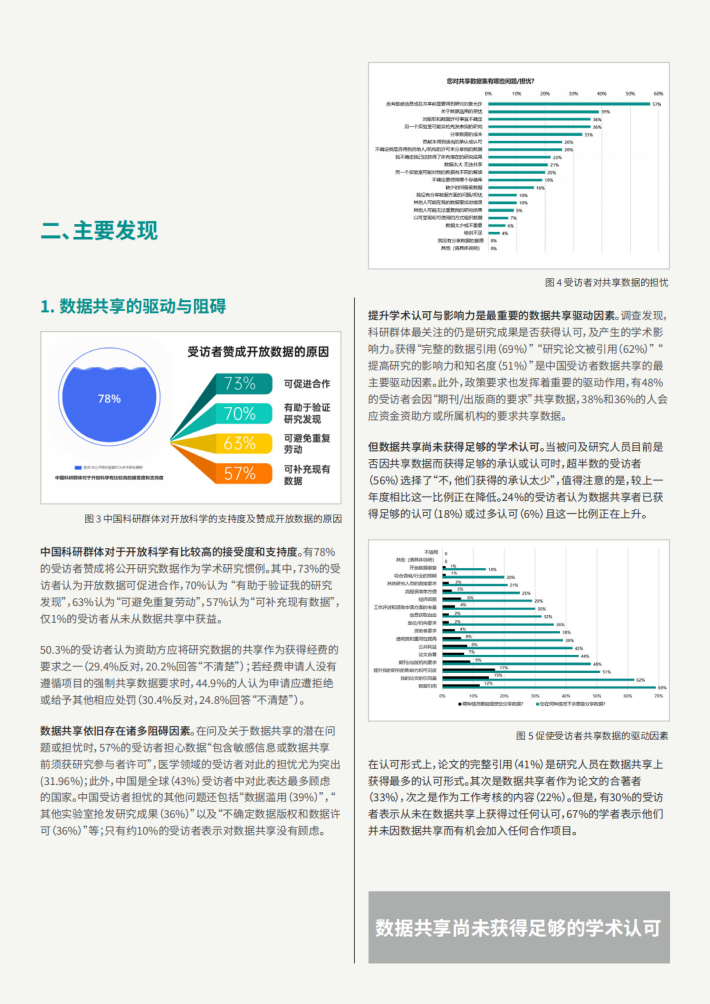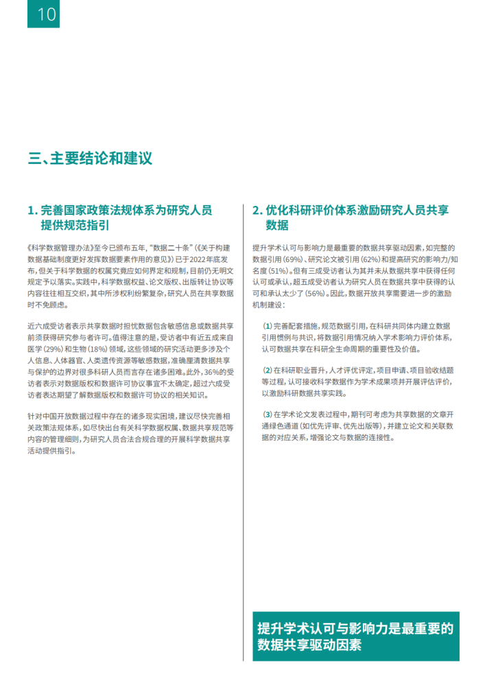 中国在全球开放科学的舞台上扮演着重要角色。在2023年的调查问卷反馈中,中国受访者占全球参与人数的11%,排全球第二。同时,中国科研群体对于开放科学有比较高的接受度和支持度。有78%的受访者赞成公开研究数据成为惯例。然而,数据共享在实践中还在敏感数据许可、数据滥用等问题上存在一定阻碍因素。因此,报告对国家政策法规体系、科研评价体系、科研机构的指导作用和数据共享最佳实践提出了相关建议。