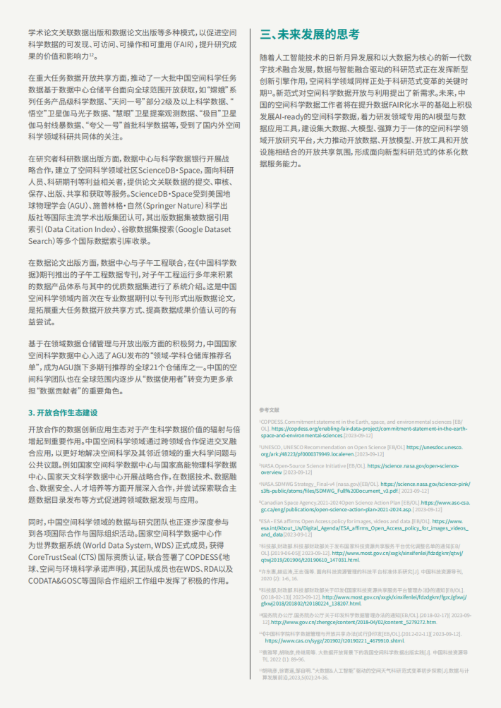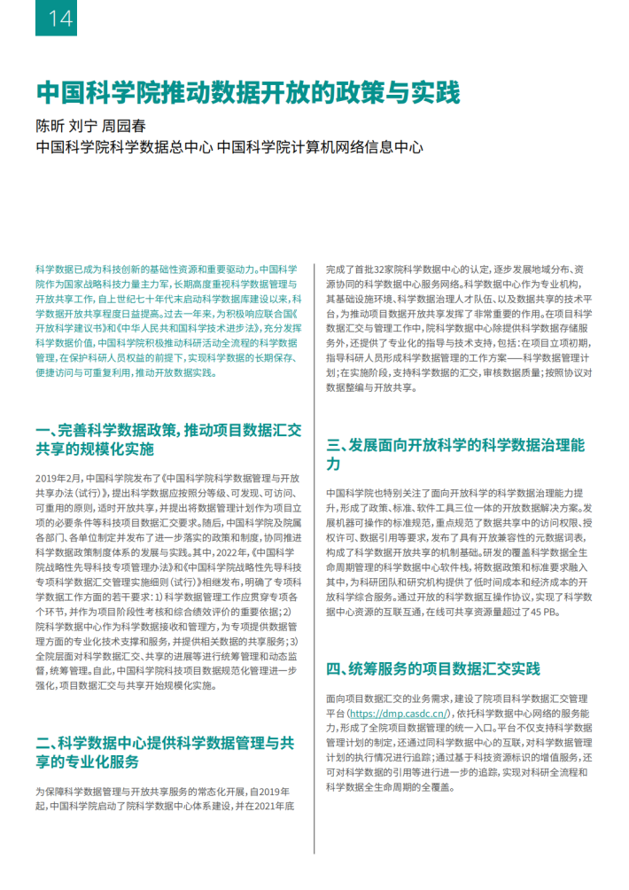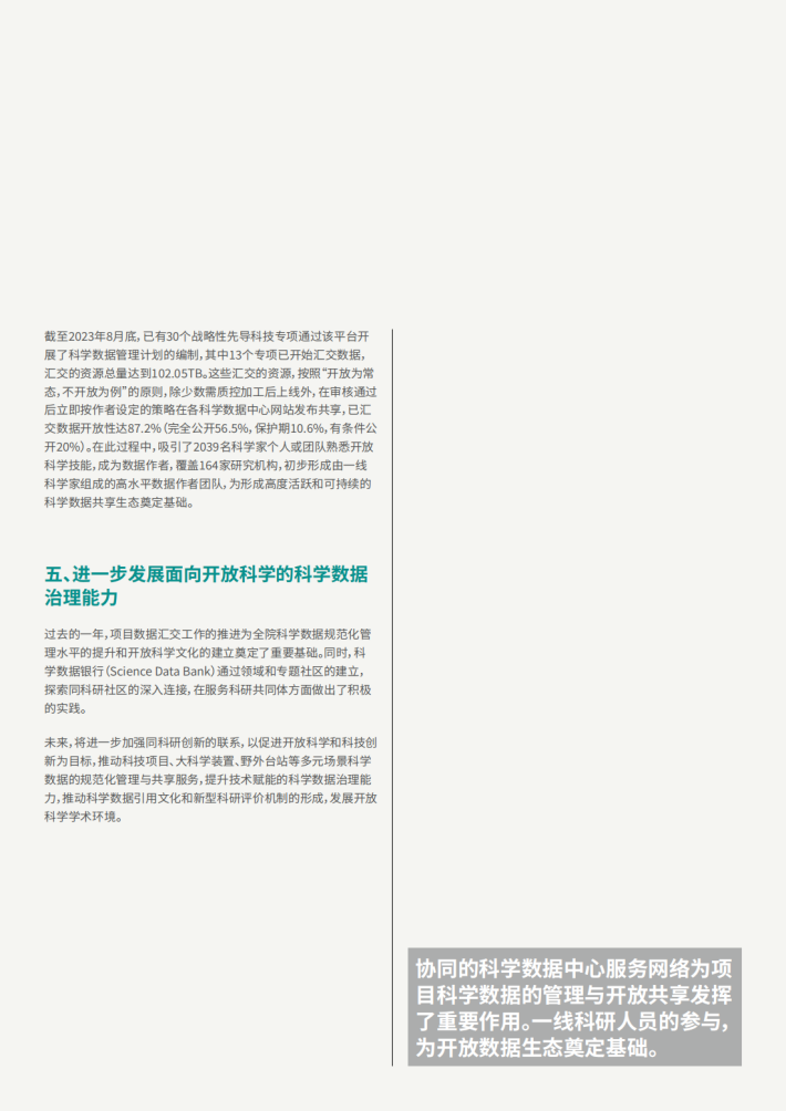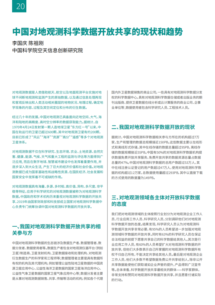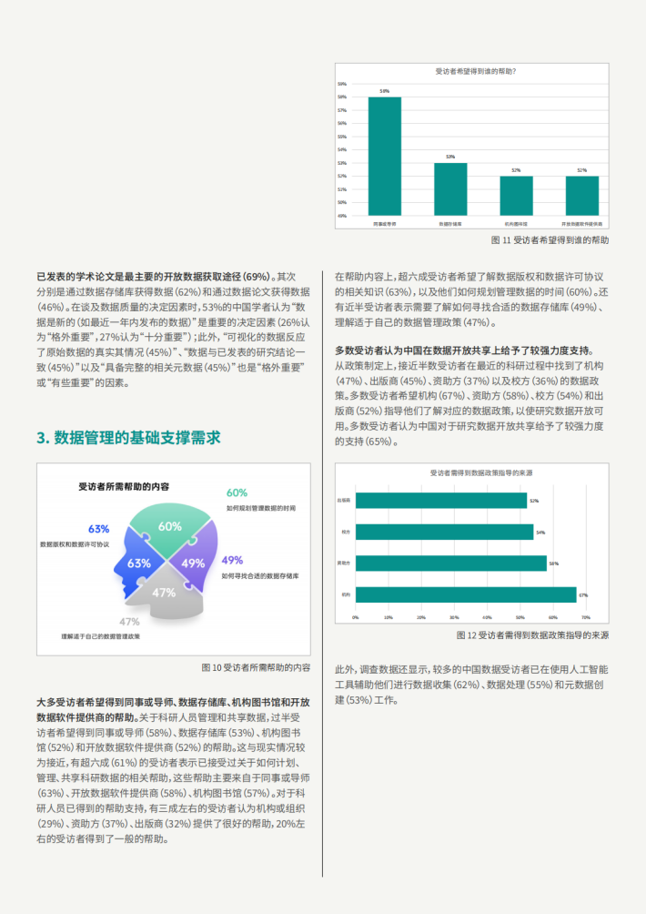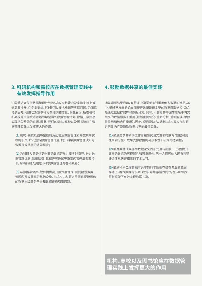 中国在全球开放科学的舞台上扮演着重要角色。在2023年的调查问卷反馈中,中国受访者占全球参与人数的11%,排全球第二。同时,中国科研群体对于开放科学有比较高的接受度和支持度。有78%的受访者赞成公开研究数据成为惯例。然而,数据共享在实践中还在敏感数据许可、数据滥用等问题上存在一定阻碍因素。因此,报告对国家政策法规体系、科研评价体系、科研机构的指导作用和数据共享最佳实践提出了相关建议。
