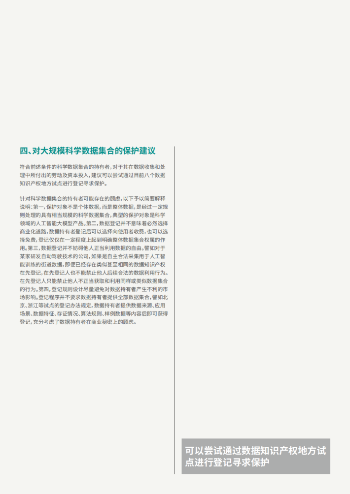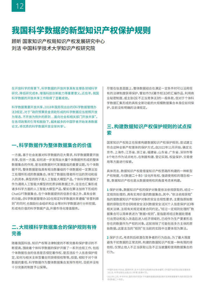 同时,报告邀请中国数据开放共享领域的专家共同参与此次报告的撰写。在政策研究与法规层面,来自国家知识产权局的顾昕等介绍了中国对于科学数据这一新型知识产权的保护规则,并对大规模科学数据集合提出保护建议,较于个体科学数据已开展的系列知识产权合规工作,大规模数据集合还缺乏完善的制度保障,亟待构建一种新型产权制度。