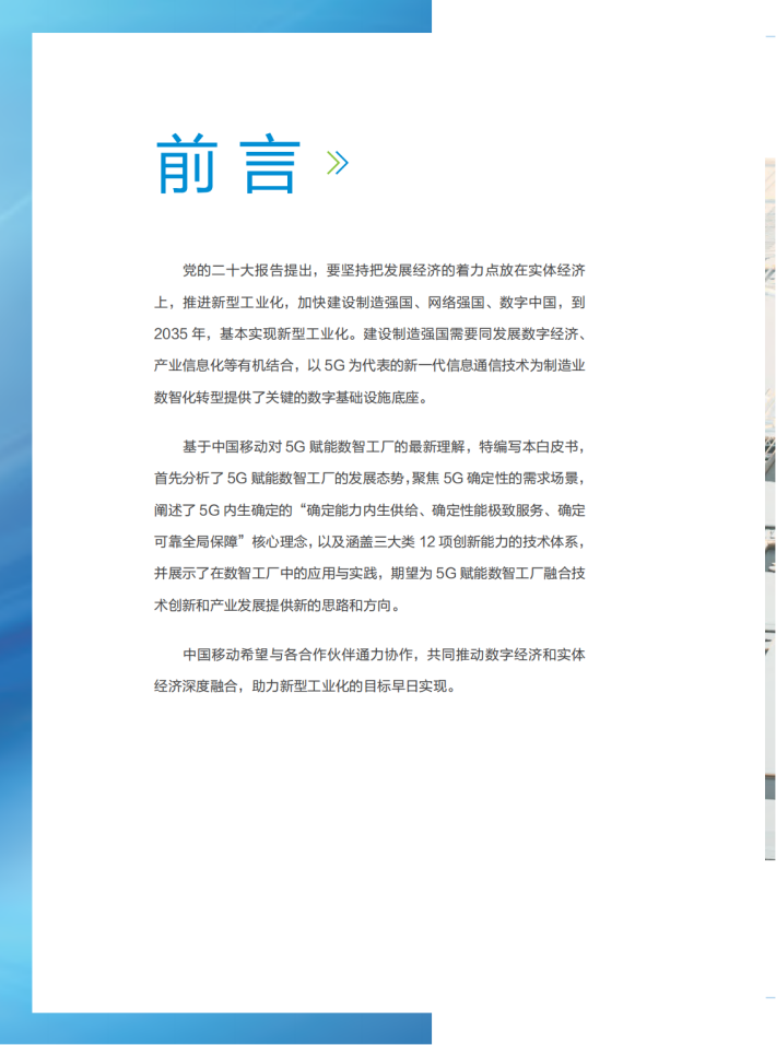 党的二十大报告提出,要坚持把发展经济的着力点放在实体经济上,推进新型工业化,加快建设制造强国、网络强国、数字中国,到2035年,基本实现新型工业化。建设制造强国需要同发展数字经济、产业信息化等有机结合,以5G为代表的新一代信息通信技术为制造业数智化转型提供了关键的数字基础设施底座。