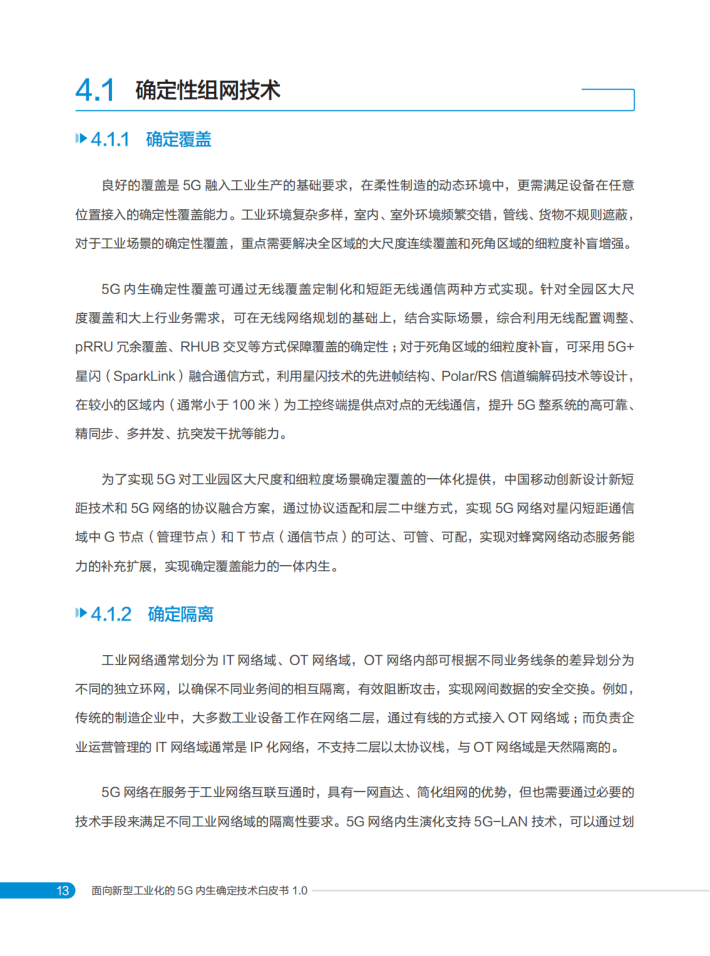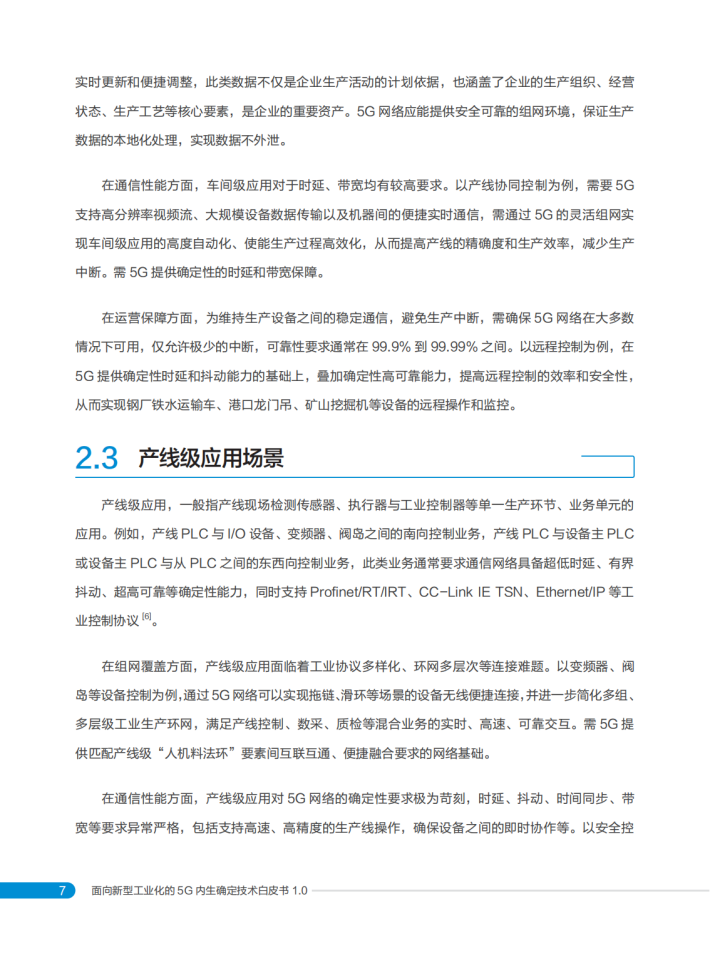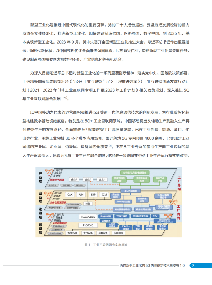 基于中国移动对5G赋能数智工厂的最新理解,特编写本白皮书,首先分析了5G赋能数智工厂的发展态势,聚焦5G确定性的需求场景,阐述了5G内生确定的“确定能力内生供给、确定性能极致服务、确定可靠全局保障”核心理念,以及涵盖三大类12项创新能力的技术体系,并展示了在数智工厂中的应用与实践,期望为5G赋能数智工厂融合技术创新和产业发展提供新的思路和方向。