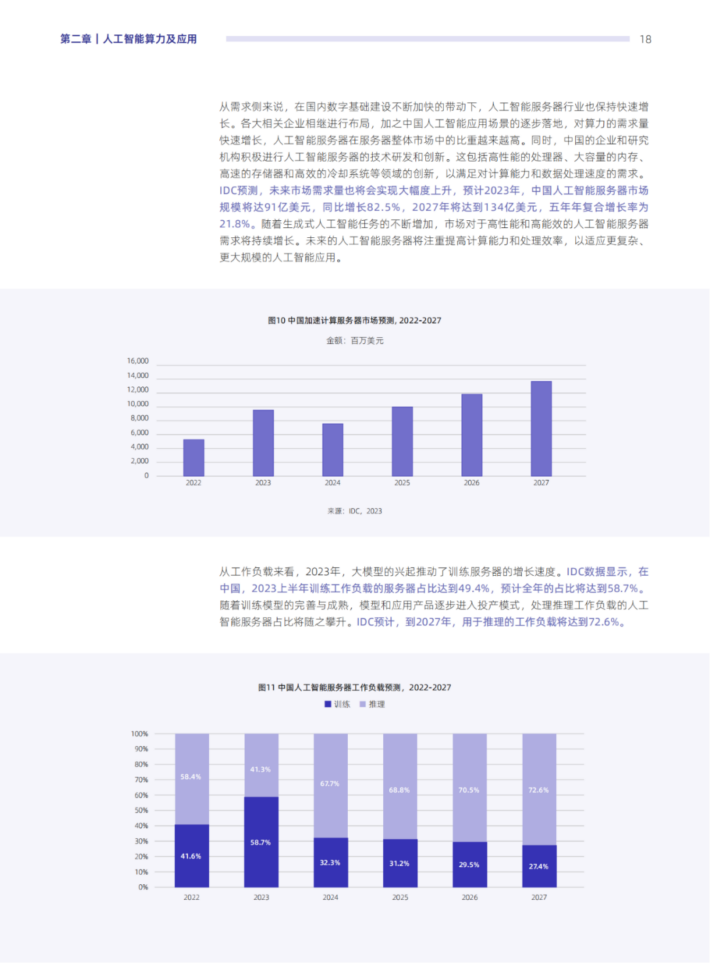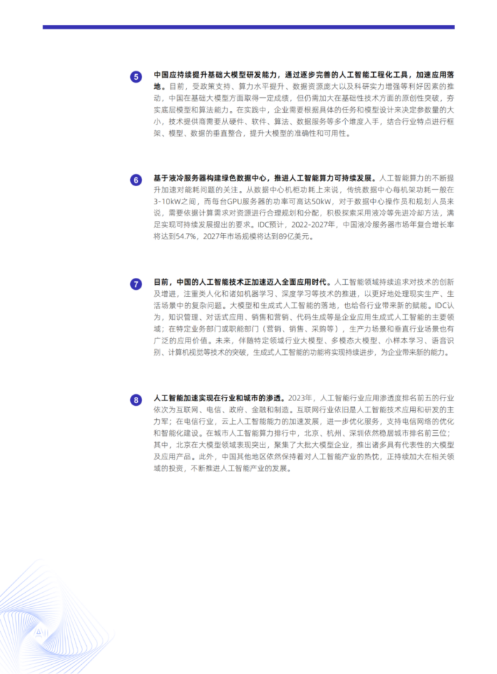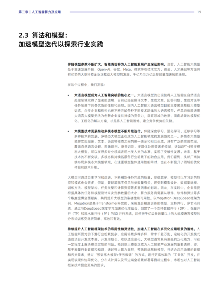 从算力服务角度而言,传统算力资源虚拟化共享复用的机制难以满足大模型时代企业对于集群式的高性能算力需求,生成式人工智能将加速企业更多地使用人工智能就绪的数据中心设施和人工智能服务器群,供应商需要具备提供定制化的、优化的基础设施服务能力,满足单个用户对训练和推理资源的独占式、大规模、长时间使用的诉求,并缩短部署时间、提高对数据和输出的控制,满足应用场景的需求,帮助企业实现成本优化。