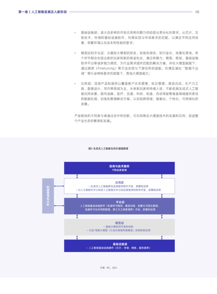 从产业动量角度而言,基础模型技术的突破为人工智能产业的发展增加活力,催生新的玩家和投资机会,基础模型的持续迭代、调优、场景适配和部署、落地等对基础设施层、模型层、平台层和应用层提出新的需求,带来新的服务模式,降低人工智能技术的应用门槛,通过微调等方法实现与下游任务的适配,加速人工智能基础设施软件的开发、部署和应用,为用户和行业提供更多创新应用。