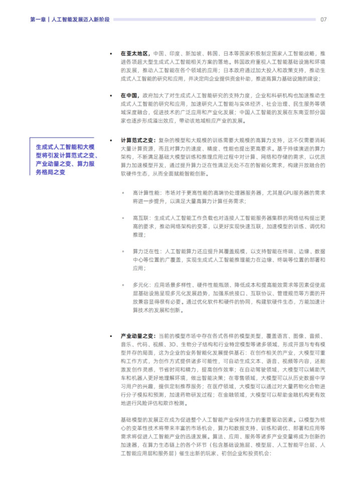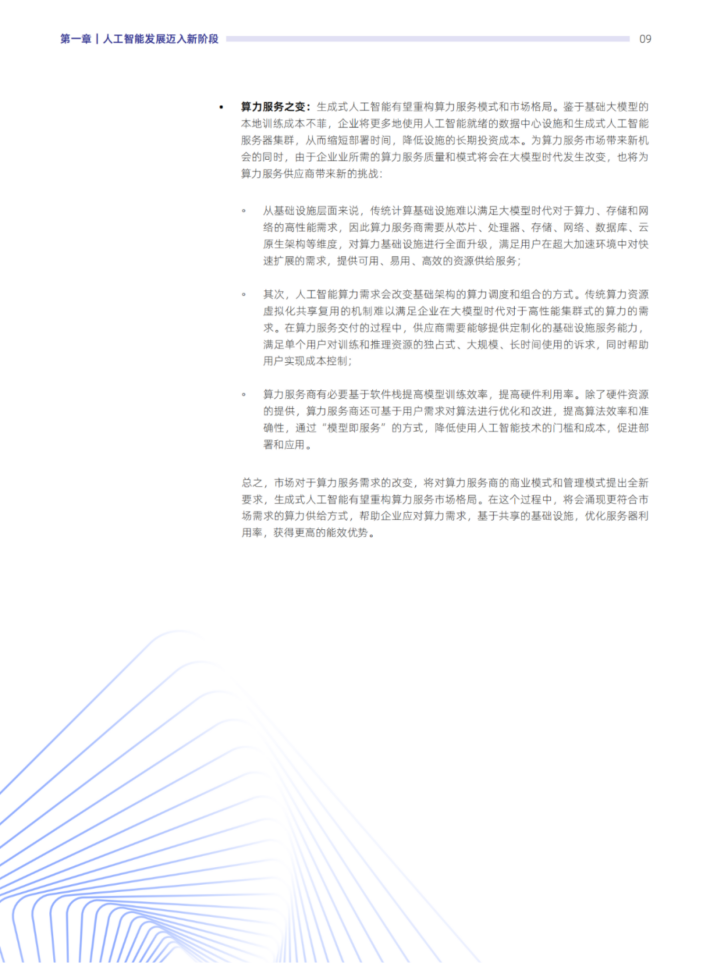 大模型和生成式人工智能的发展将引发计算范式之变、产业动量之变,以及算力服务格局之变。未来几年,构建和调优生成式人工智能基础模型以满足应用需求,将为整个基础设施市场带来改变和发展机遇。