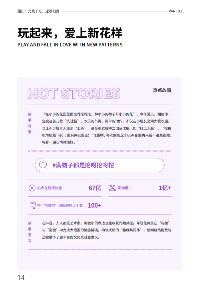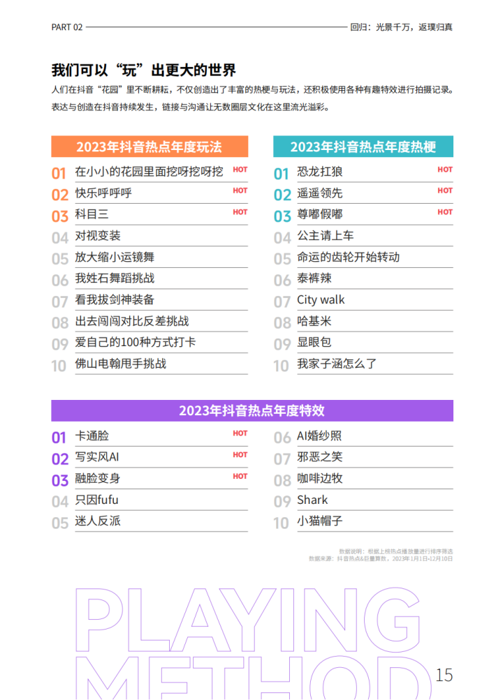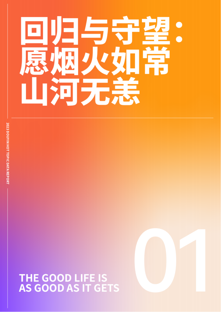抖音热榜见证的过去一年中,既有“淄博烧烤”和“快乐穿搭”的滋味,又有“狂飙”“乘风2023”和“全抖音复诵满江红”的燃情;既可城市漫游细细品味松弛生活,又能在杭州亚运会一览华彩的高光时刻。这一年我们聚焦“一带一路”论坛与各国共谋发展,我们关注全国两会又给我们的生活带来了什么新变化;这一年我们见识了很多新鲜技术,也送别了许多熟悉的面孔。这是充满了变化的一年,面对外部的不确定性与快节奏的社会生活,我们放弃随波逐流转而向内求索回归自我,我们放下繁忙工作尝试亲近自然回归生活、我们穿回国货汉服听上管弦丝竹回归本土文化。